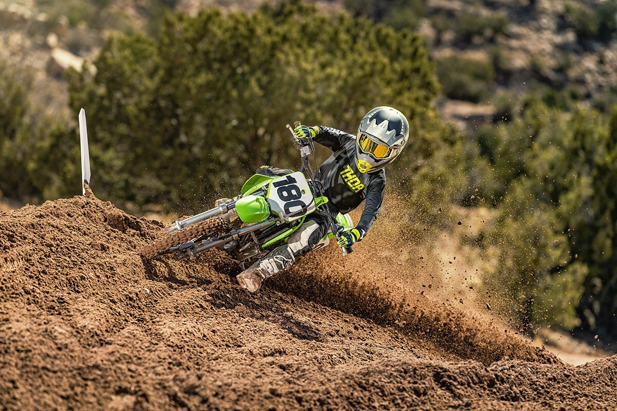 The KX65 motorcycle is the ideal dirt bike for introducing young racers to the competitive ranks of motocross. With a 64cc engine, durable chassis and proven agility to turn lap after lap, the KX65 allows riders to gain experience and build skills on a dependable platform. |
