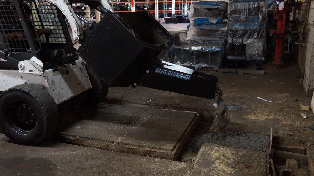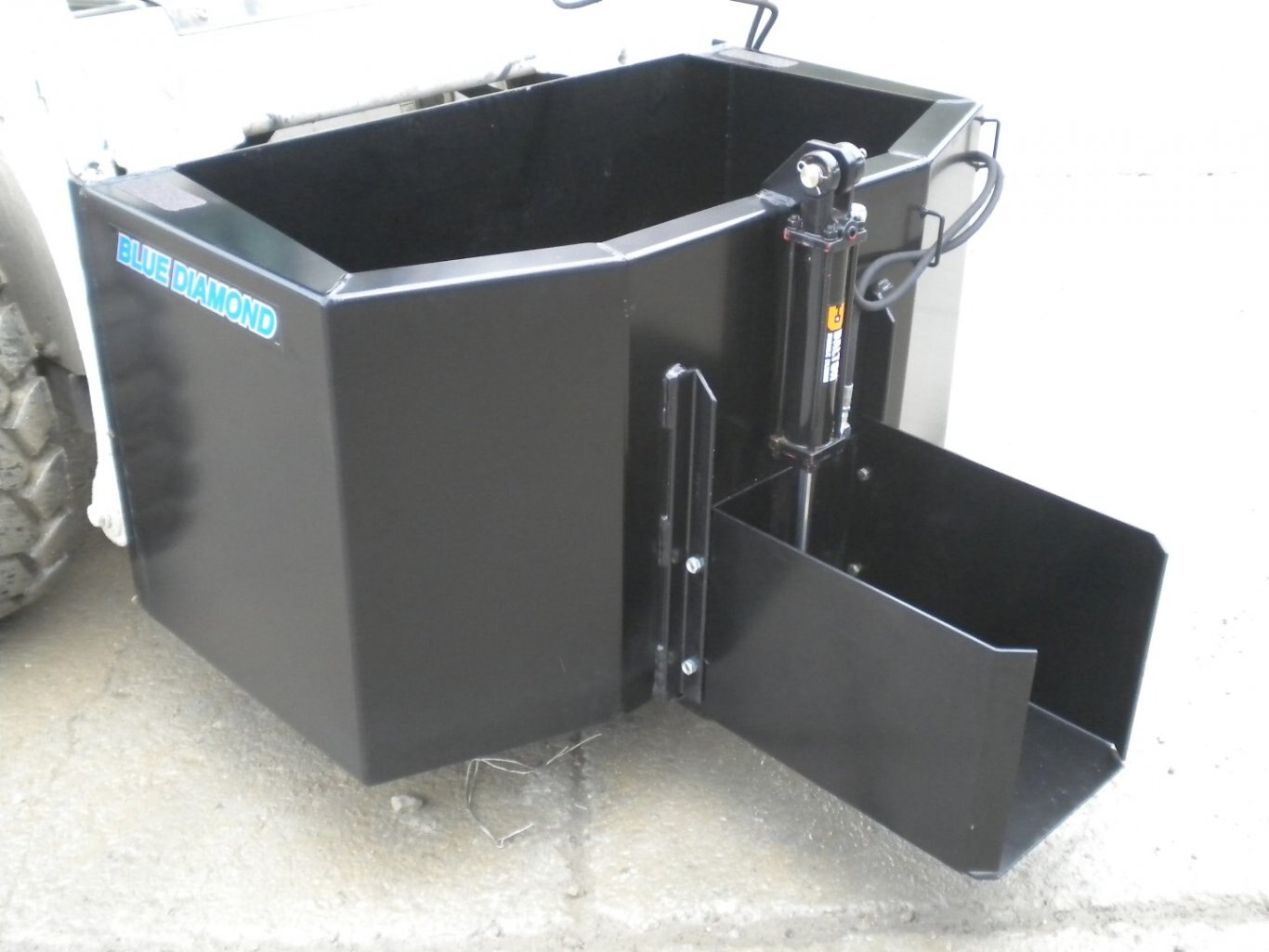 | The Blue Diamond dispensing bucket is for any flowable material from feed to concrete. The ½ yard hopper has splash guards around the top to contain material while traveling on rough terrain. The heavy duty chute is enclosed at the back to control the flow and can be removed for transportation or storage. |