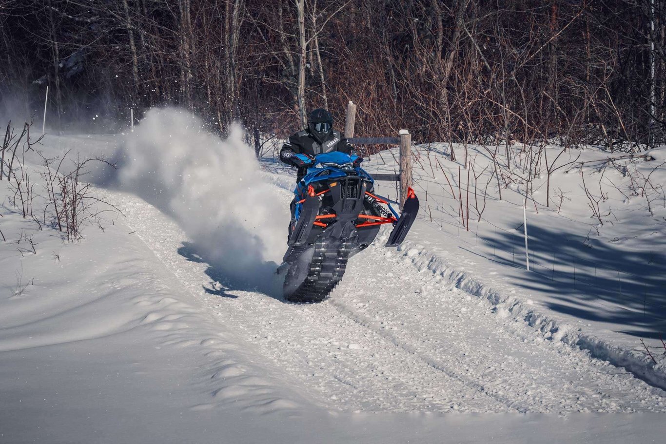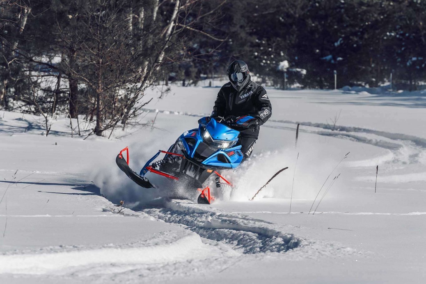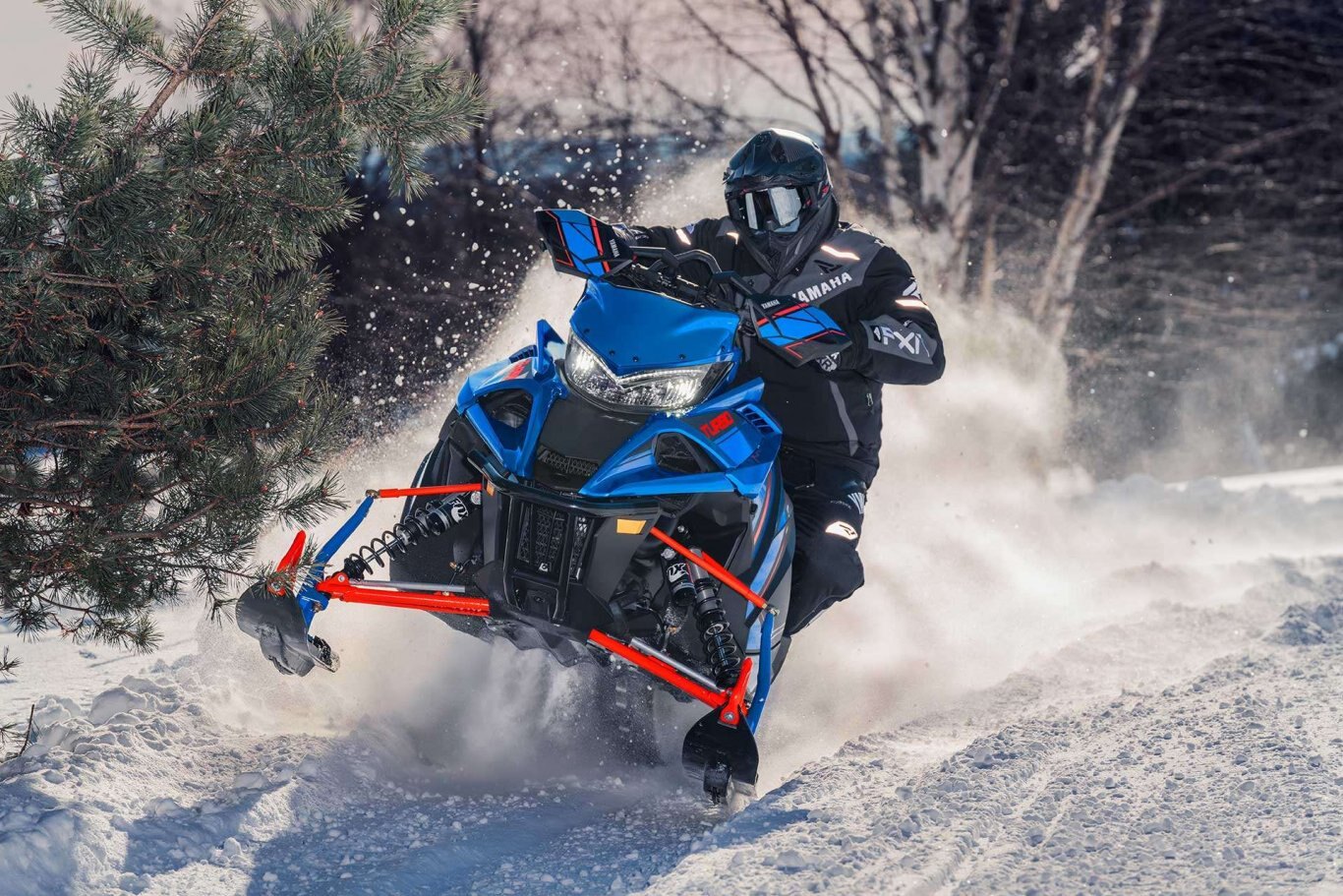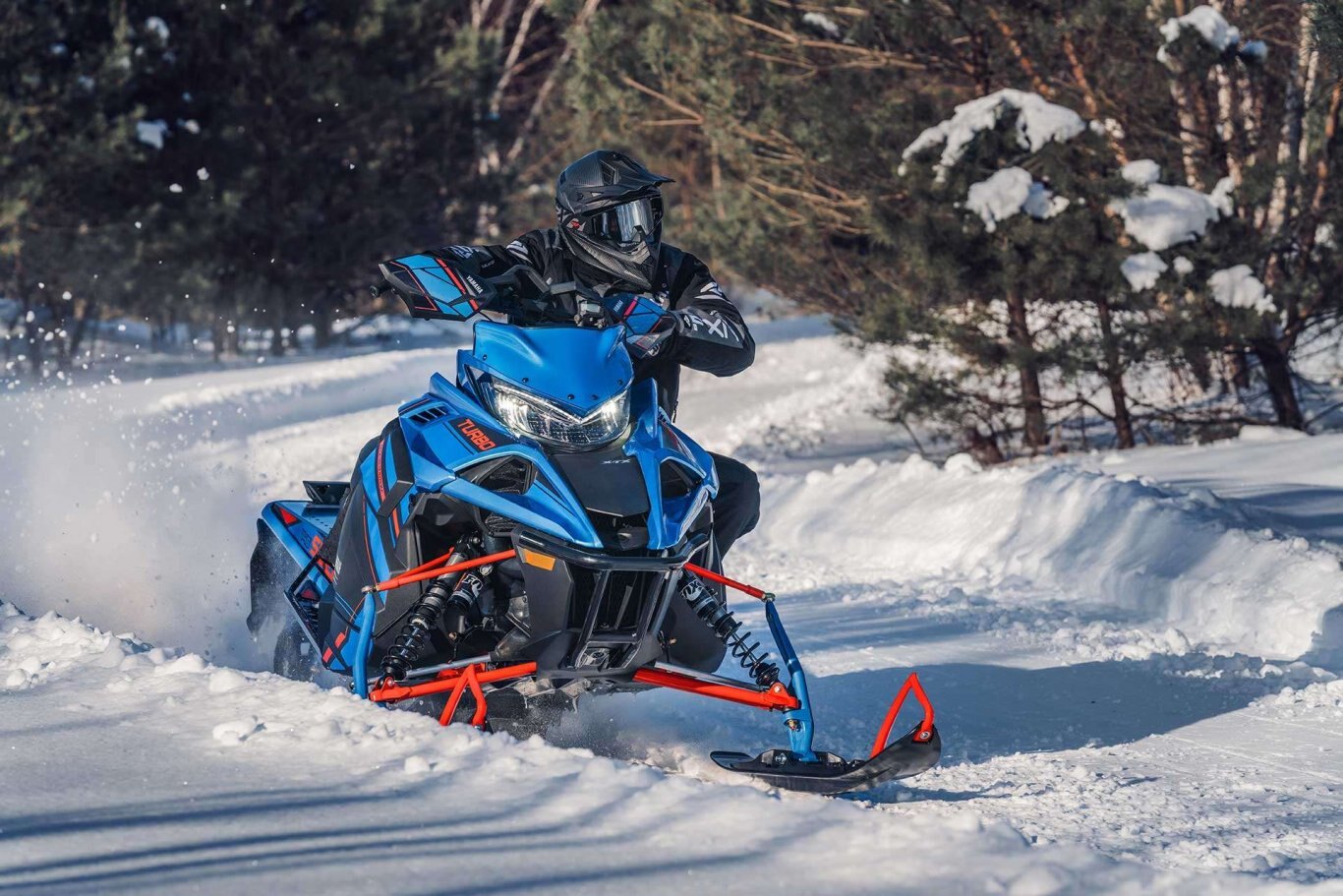 | The Sidewinder X-TX SE is more about getting off-trail with its quick transfer, VersAttak 146 rear suspension and 2.00" deep-lug Camso 'Challenger' track. The front end sports a narrower 40" ski stance supported by wide Yamaha Mountain skis. The tunnel and steering system is based on the SR-M Mountain chassis complemented with a light weight mountain seat, tapered foot boards and Stealth controls. Top-shelf Fox® Zero QS3 shocks are found up front to accommodate a wide range of terrain and riding styles. The Genesis Turbo adds a power packed punch of fun to any outing. |