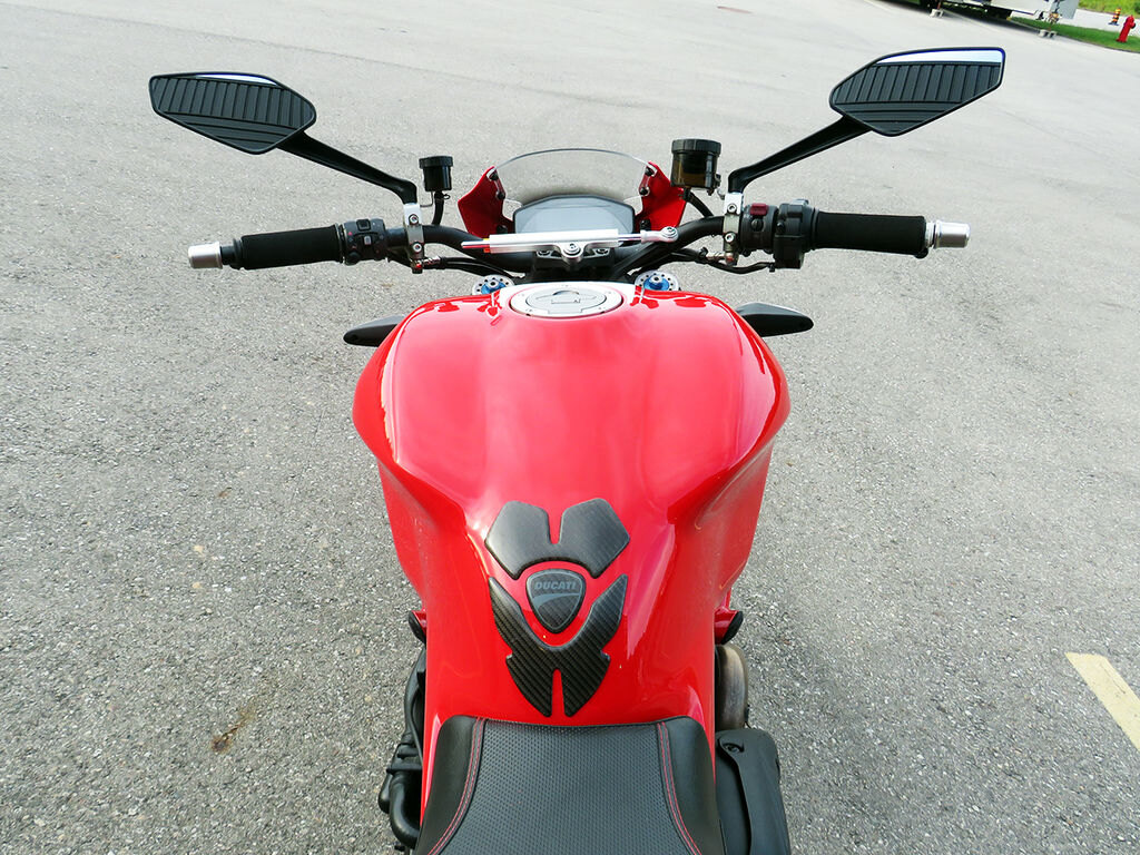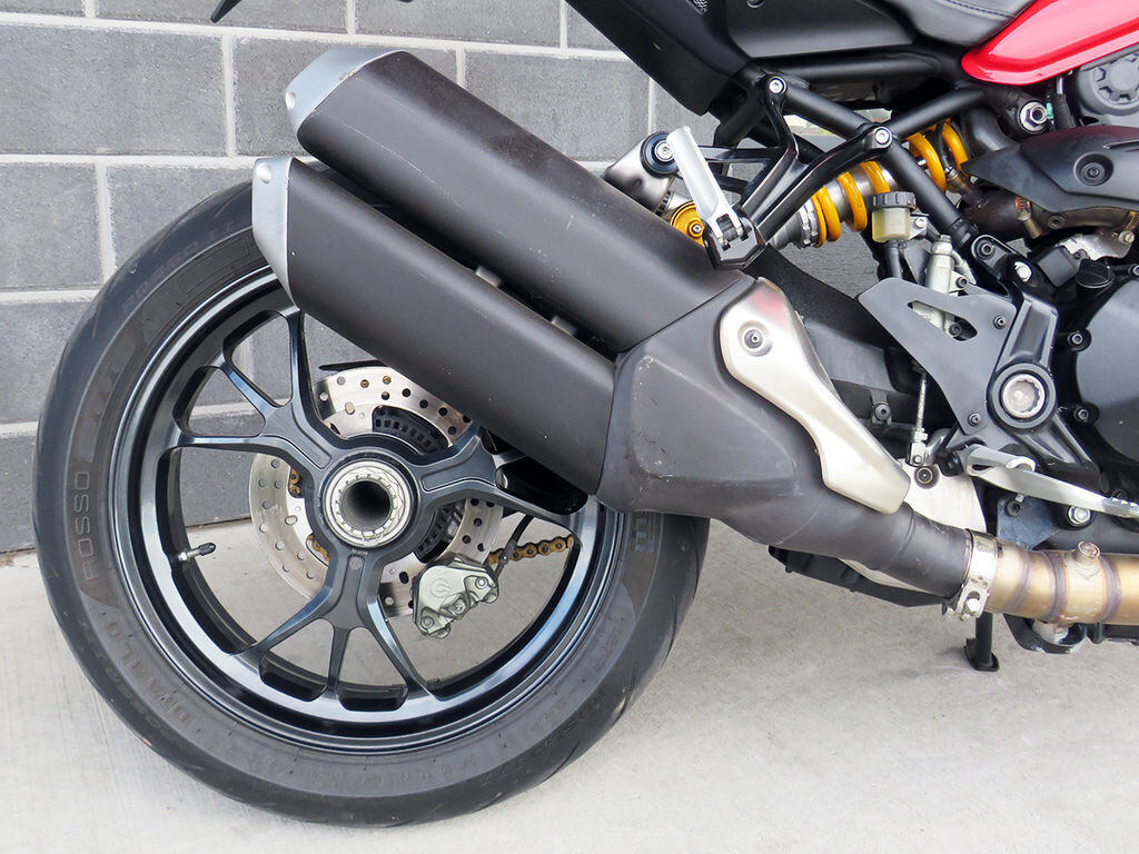 "R" engineThe Monster 1200 family is powered by the second generation of Testastretta 11° DS engine, smoother and with dual spark plugs and a secondary air system. Dual Spark (DS) ignition uses two plugs per cylinder to ensure complete combustion in a very short time. A secondary air system similar to that of the 1299 Panigale has been introduced to optimise operation and reduce cyclic combustion variability without affecting emissions. A controlled flow of fresh air is supplied to the exhaust duct to enable complete oxidisation of hot unburnt gases, to effectively reduce hydrocarbon and carbon monoxide levels. The Testastretta 11° DS engine that equips the Monster 1200 family is unique to those bikes, as its structure is engineered to be a structural element of the frame.