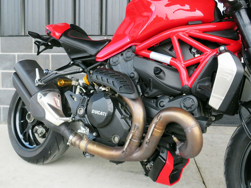 \"R\" engineThe Monster 1200 family is powered by the second generation of Testastretta 11 DS engine, smoother and with dual spark plugs and a secondary air system. Dual Spark (DS) ignition uses two plugs per cylinder to ensure complete combustion in a very short time. A secondary air system similar to that of the 1299 Panigale has been introduced to optimise operation and reduce cyclic combustion variability without affecting emissions. A controlled flow of fresh air is supplied to the exhaust duct to enable complete oxidisation of hot unburnt gases, to effectively reduce hydrocarbon and carbon monoxide levels. The Testastretta 11 DS engine that equips the Monster 1200 family is unique to those bikes, as its structure is engineered to be a structural element of the frame.