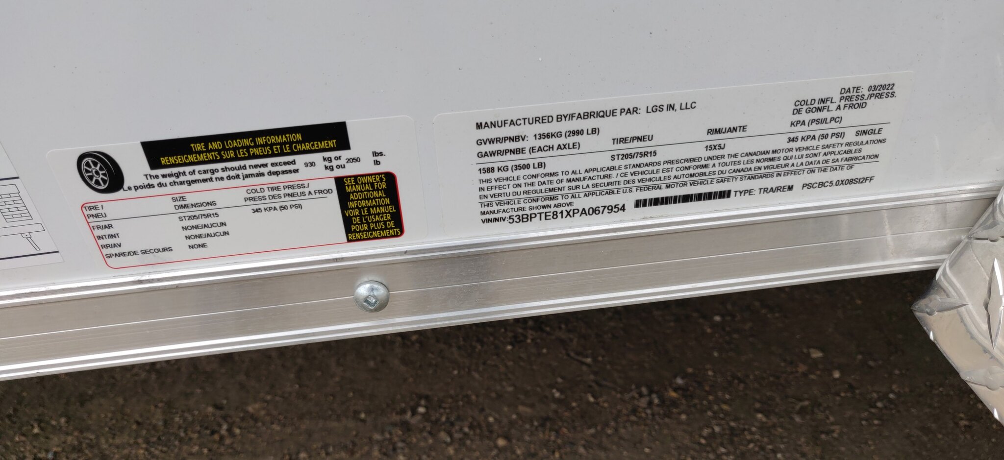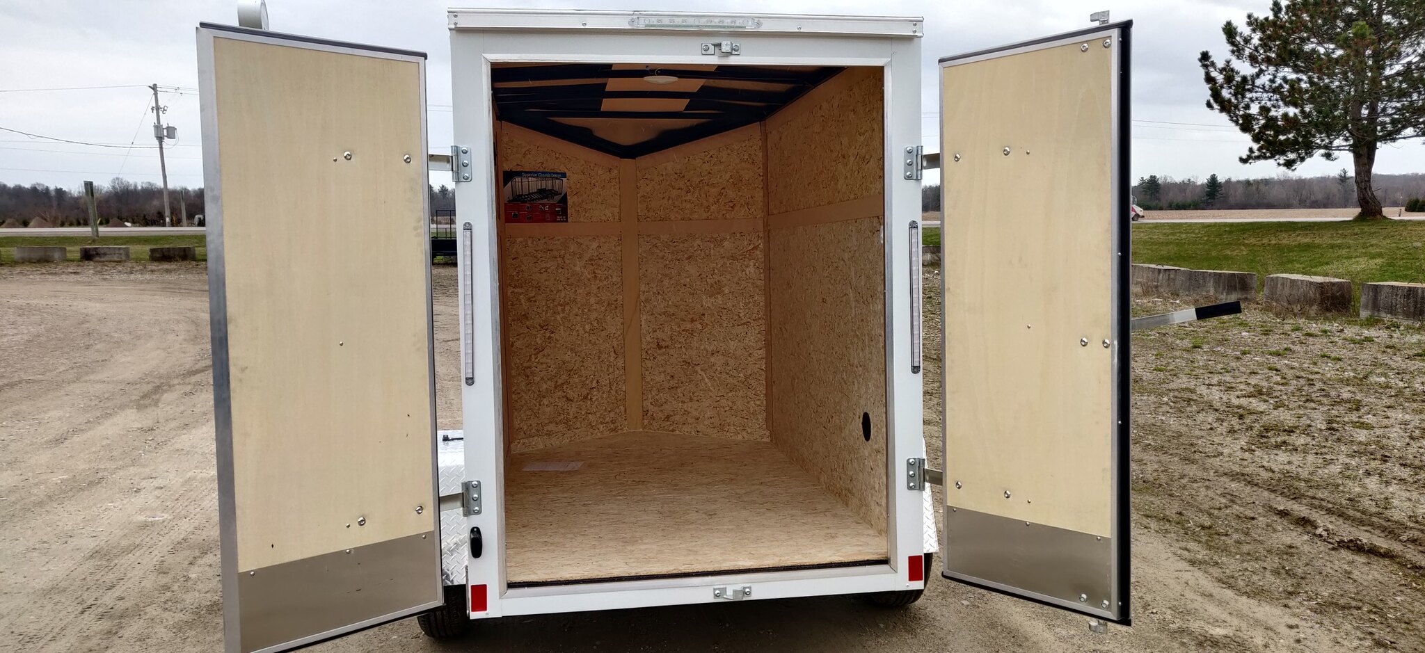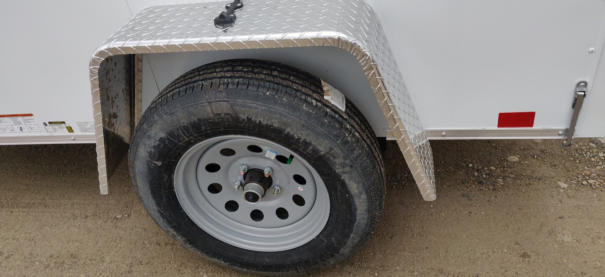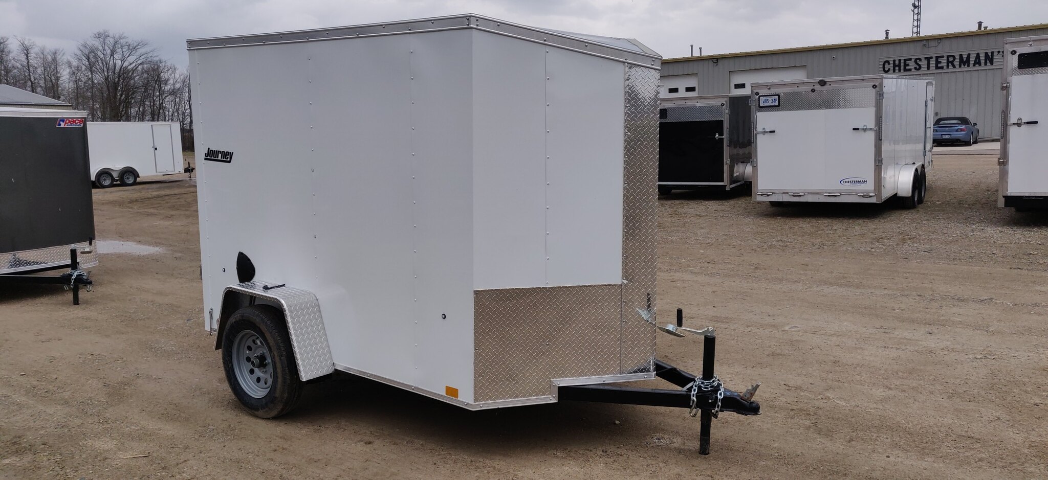 Style: Journey SE / Flat Top / 24in Sloped V-Nose Axle: Single/drop/Idler 2990 GVW Axle Type: (1) 3500 LB Spring w/ Superlube Hubs Tire: (2) ST205/75R15 5 Lug Radial Rim: (2) Silver Mod Main Frame: 2x3in Tube w/ZXMs 16 in on center Main Frame: Undercoated Coupler: 2 inch ball Hitch: 2 Piece Jack: 2000lb top wind w/ sand pad Vertical Post: 72-3/4in VPH (\6in Height = 72\" Inner Height) Sidewall: Z-Post/16in centers/24in sloped v-nose Roof Bow: 1 x 1-1/4 semi crowned tube 24in centers Floor: 3/4in High Performance Wall: High Performance Ceiling: None Exterior Metal: Screwless w/ screwed seams and colour matching screw Exterior Metal: 0.030 White Exterior Metal: Vertical rub rail front and rear of box Front Nose: ATP 0.025 Embossed Stoneguard: 24in high ATP 0.025 embossed Fender: ATP Jeep Style Roof: One piece aluminum Roof: 16in wide 2.7 Lauan Ridge Board Top Trim: 2-1/2in Bottom Trim: 1-1/2in License Plate Bracket: Molded Plastic Rear Door: Double rear doors C/L with metal hold backs Side Door: None Vent: (2) Sidewall flow through vents Dome Light: (1) LED Dome light centered 12 Volt Switch: (1) C/S Rear Cable: 4-way Clearance Light: Bullet LED Clear Lens License Plate Light: Yes Tail Light: (2) LED Clear lens slimline