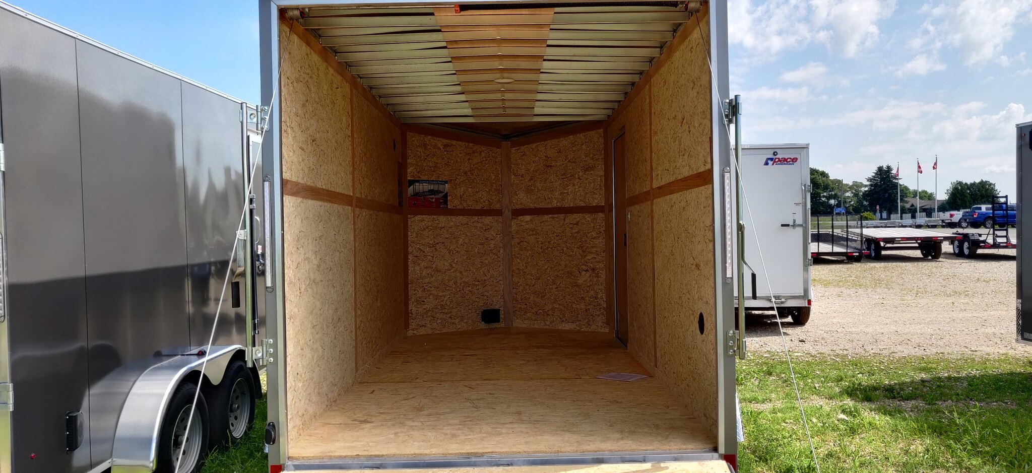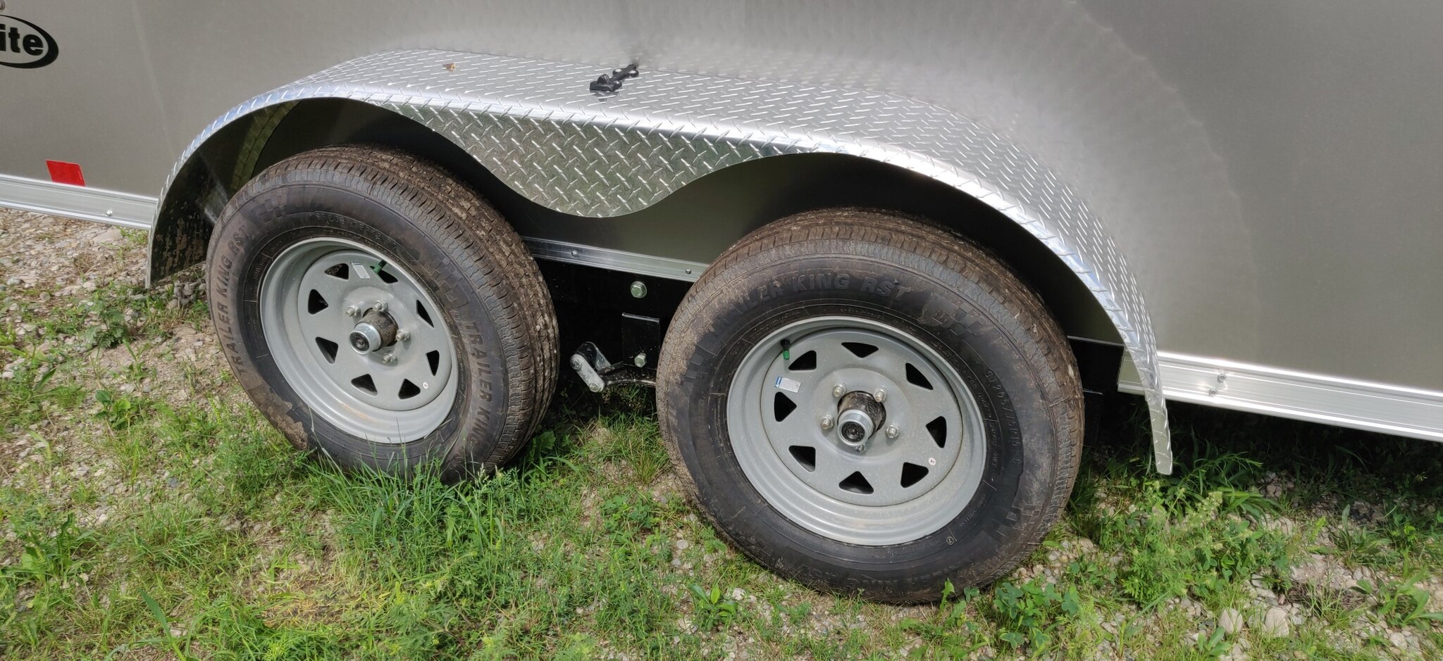 Style: Aluminum Cargo Trailer / Flat Top / 24in Sloped V-Nose Axle: Tandem / Drop / Electric Axle Type: (2) 3500lb Spring w/ Superlube Hubs Tire: (4) ST205/75R15 5 Lug Radial Rim: (4) Silver MOD Main Frame: Aluminum Tube w/Tube XM\'s / 16in On Center Coupler: 2-5/16in Hitch: 3 Piece Jack: 2000lb top wind w/ sand pad Vertical Post: 81-1/2in V.P.H. Sidewall: 1in x 1-1/2 Aluminum Tube / 16in on Center / 24in Sloped V-Nose Roof Bow: 1in x 2in Aluminum Semi Crowned Tube / 16in on Center Floor: 3/4in high performance Wall: High performance Ceiling: None Exterior Metal: 0.030\" Pewter Exterior Metal: Screwless Stoneguard: 24in High ATP 0.025 Embossed Fender: ATP Tandem Teardrop Roof: 1 Piece Aluminum Roof: 24in wide 2.7in Lauan ridge board Rear Hoop: Same colour as trailer Top Trim: 2-1/2in Bottom Trim: 2-1/2in License Plate Bracket: Molded plastic Rear Door: 250 series ramp door w/ spring assist w/ (2) Bar locks / (2) Aluminum Grab Handles w/ Drip Rail Above Door and 16in Ramp Extension Side Door: 32w x 74h C/S F/L w/ Aluminum Hold Back and Drip Rail above Door Starting 16in From Front Vent: (2) Sidewall flo thru vents (Black) Dome Light: (1) LED Dome light centered 12 Volt Switch: (1) C/S Door Breakaway: Breakaway battery w/ switch Cable: 7 way Clearance Light: 3/4\" Bullet LED Clear Lens License Plate Light: Yes Tail Light: (2) LED Clear lens slimline w/ integrated backup light