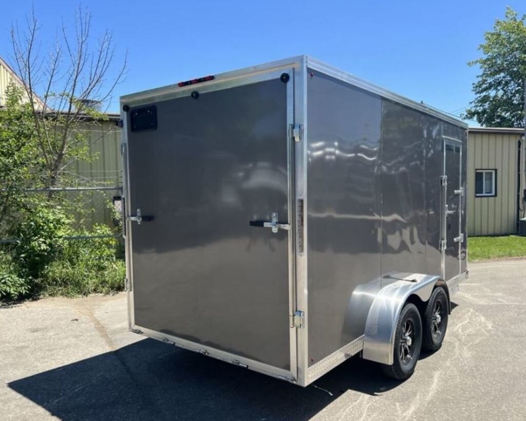 Accessories: OVERALL LENGTH -23 3\" OVERALL WIDTH- 8 8\" OVERALL HEIGHT - 8 10\" INTERIOR LENGTH (BOX) - 17 9\" INTERIOR (V-NOSE)-39\" INTERIOR WIDTH -6 7\" INTERIOR HEIGHT- 6 6\" ROAD-TO-FLOOR-15\" REAR DOORS easy-drop ramp OPENING WIDTH -6 4\" OPENING HEIGHT -81\" SIDE DOOR 32\" flush-lock OPENING WIDTH-30\" CURB WEIGHT 2,000 lbs GVWR- 7,000 lbs LOAD RATING-5,000 lbs DOOR HARDWARE zinc galvanized NOSE DESIGN wind-cutter wedge GRAVEL GUARD aluminum checker-plate FENDERS sculpted .095 aluminum OUTER CLADDING and FRONT CORNERS screwless .030 high-grade aluminum INNER SIDEWALLS and ROOF CONSTRUCTION 3/8-inch Dry max plywood with 16-inch on FLOOR CONSTRUCTION 3/4-inch Dry max with 16-inch on-centres FRAME CONSTRUCTION integrated triple-tube tongue and frame configuration DROP AXLES two axles rated 3,500 lbs (7,000 GVWR) BRAKES electric on one axle HITCH FORMAT A-frame with 2 5/16? ball receiver AIR VENT flow-through (optional) TIRES ST205/75R15 radials WHEELS stylish silver-black aluminum EXTERIOR LIGHTS LED stop, tail, turn and marker INTERIOR LIGHTS LED wall-mount (2) Add-Ons and Options: D-rings $50 each installed E-track 10-foot length $120 installed (or $60 supplied) Side vents $50 each installed Blacked-out exterior $199(black fenders add $100) Spare wheel/tire starting at $159 For more information and models vist: https://www.paradise-recreation.com/