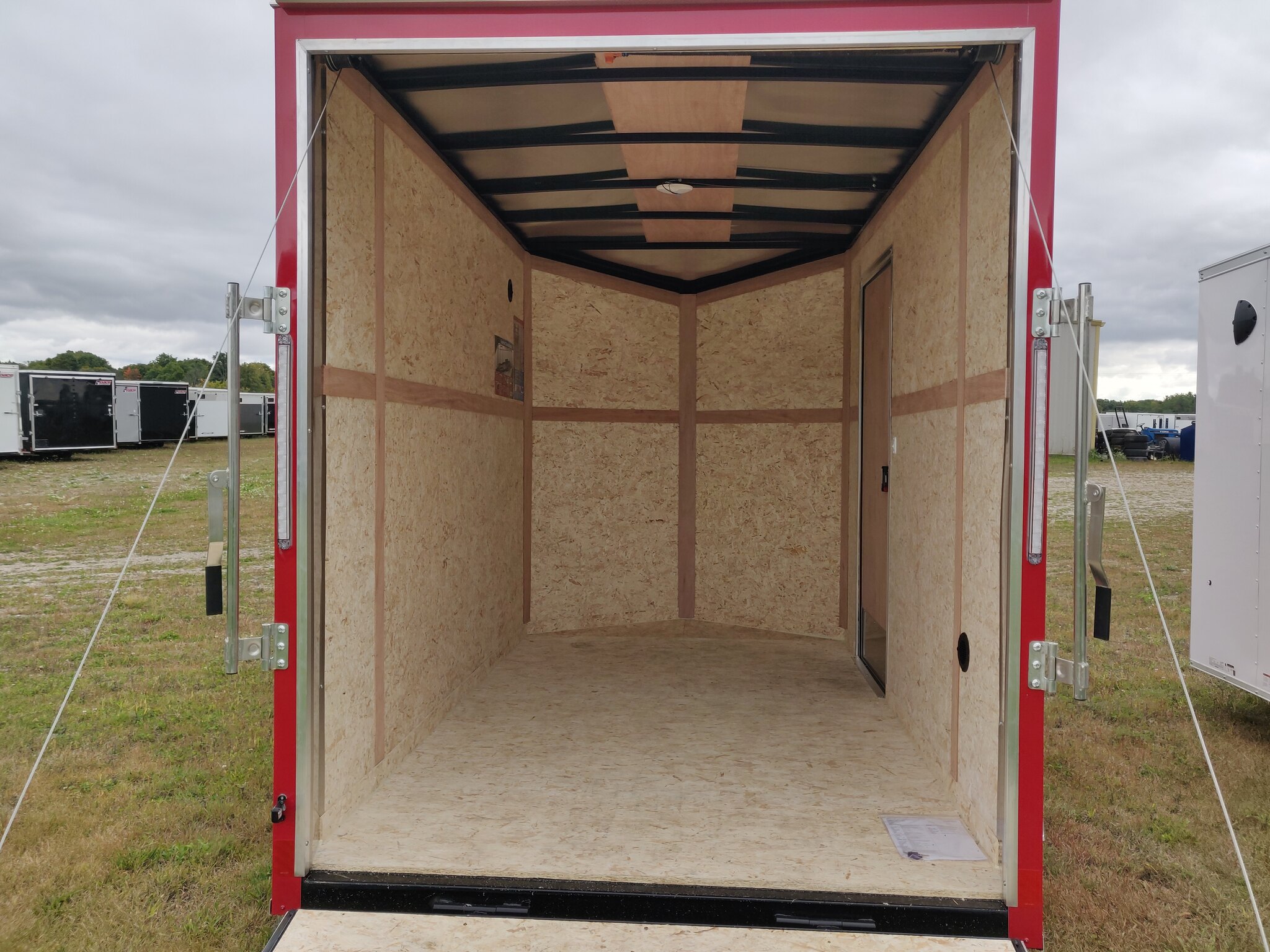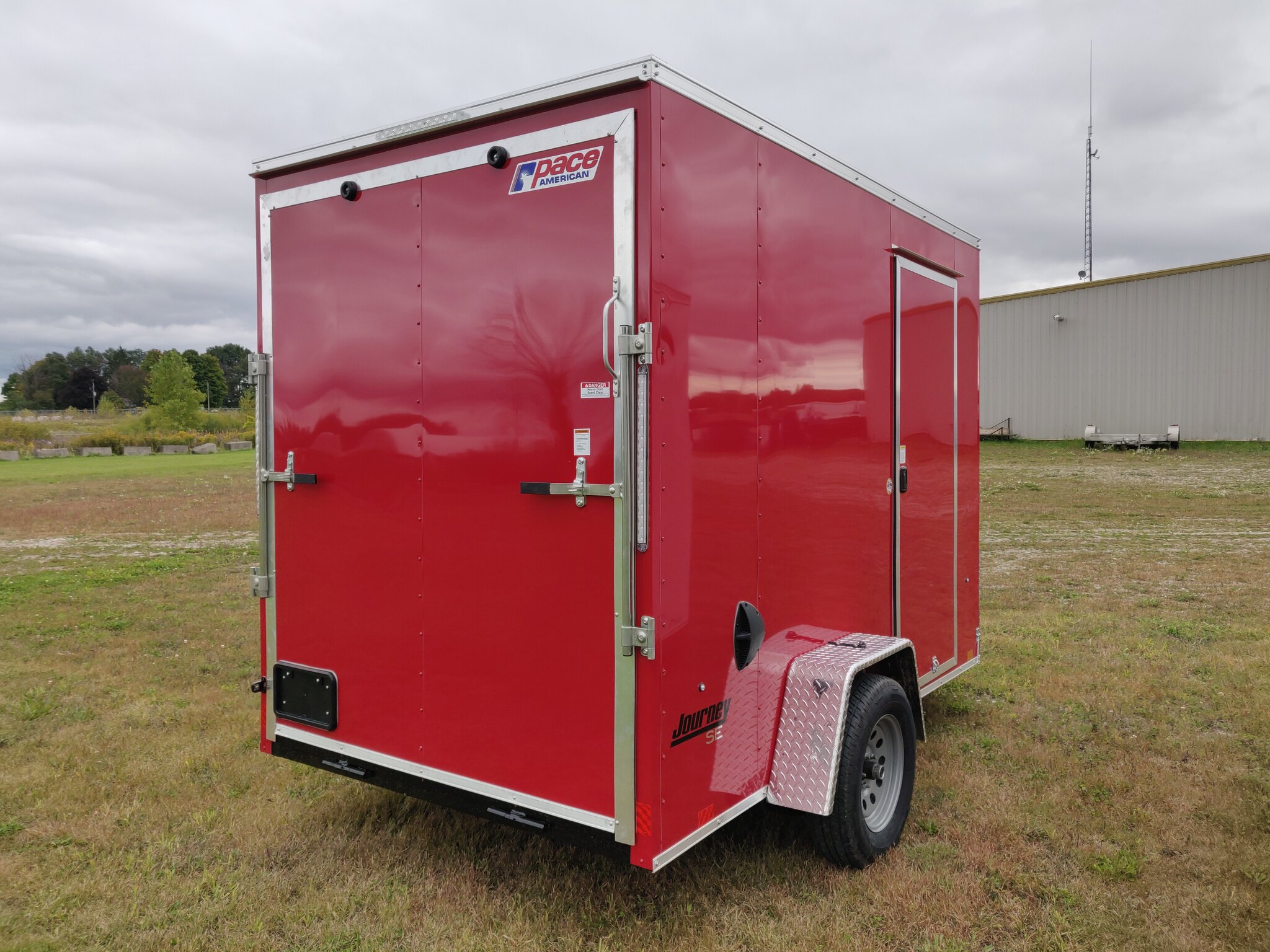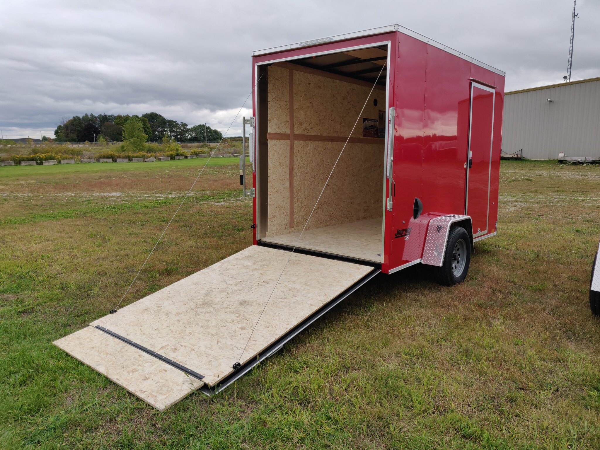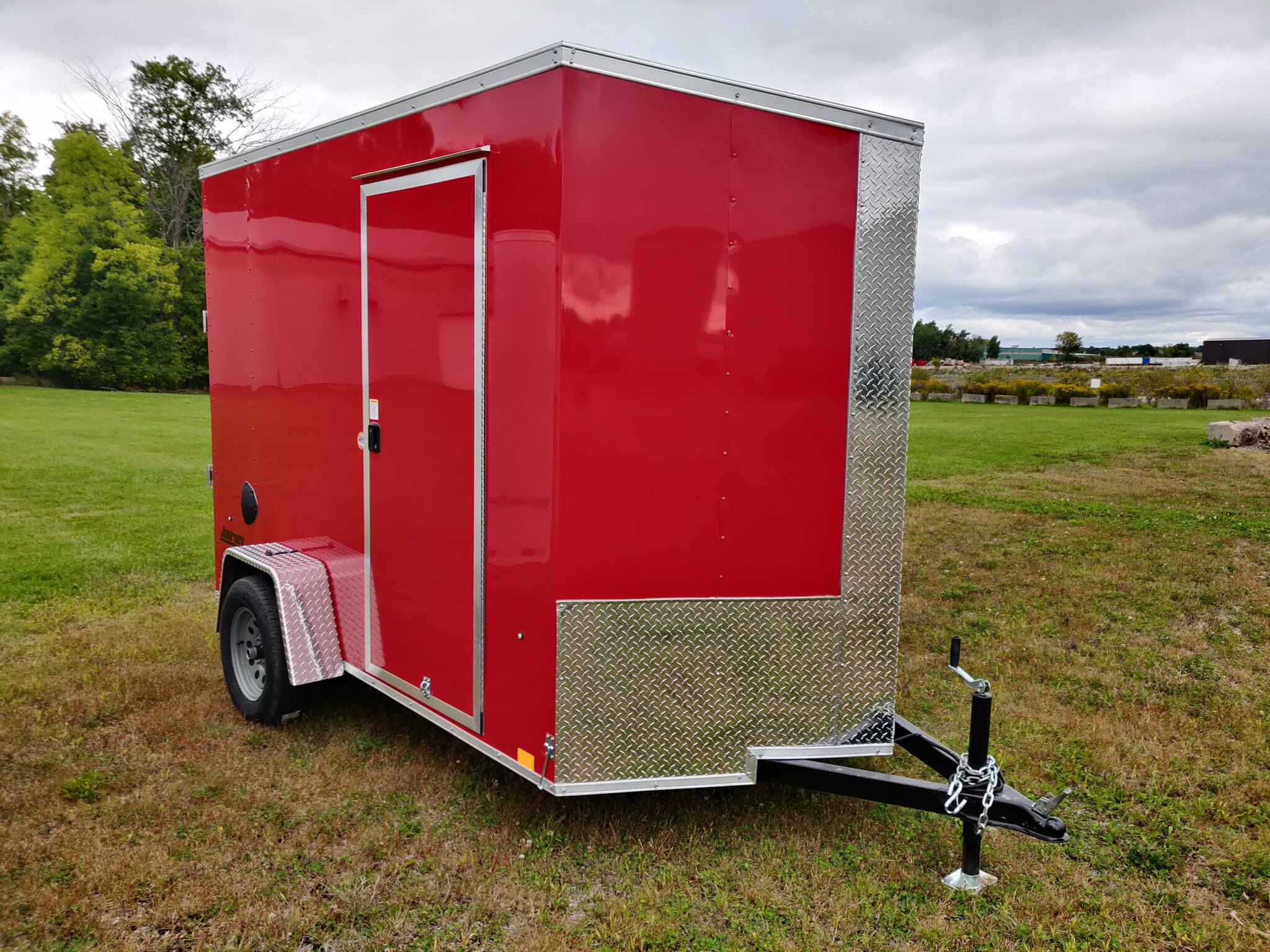 Style: Journey SE / Flat Top / 24in Sloped V-Nose Axle: Single/drop/Idler 2,990 GVW Axle Type: (1) 3500 LB Spring w/ Superlube Hubs Tire: (2) ST205/75R15 5 Lug Radial Rim: (2) Silver Mod Main Frame: 2x3 Tube w/ZXMs 16in on center Main Frame: Undercoated Coupler: 2 inch ball Hitch: 2 Piece Jack: 2000lb top wind w/ sand pad Vertical Post: 84-3/4in VPH (\12\" of Height = 84\" IH) Sidewall: Z-Post/16in centers/24in sloped v-nose Roof Bow: 1 x 1-1/4 semi crowned tube 24in centers Floor: 3/4in high performance Wall: High Performance Ceiling: None Exterior Metal: Screwless w/ Screwed Seams and Coloured Matching Screws where applicable Exterior Metal: 0.030 Red Front Nose: ATP 0.025\" Embossed Stoneguard: 24in High ATP 0.025 Embossed Fender: ATP Jeep Style Roof: 1 Piece aluminum Roof: 16in wide 2.7 Lauan Ridge Board Rear Hoop: Same colour as trailer Top Trim: 2-1/2in Bottom Trim: 1-1/2in License Plate Bracket: Molded Plastic Rear Door: 150 Series ramp door / spring assist w/ (2) Zinc bar locks and large J-Trim w/ Drip Rail above door Door Accessories: 12in x 3/4 High Performance Ramp Extension Side Door: 32w x 74h C/S F/L w/ Wire Hold Back and Drip Rail above Door Start 16in from Front Vent: (2) Sidewall flow through vents (Black) Dome Light: (1) LED Dome light centered 12 Volt Switch: (1) C/S Rear Cable: 4-way Clearance Light: 3/4in Bullet LED Clear Lens License Plate Light: Yes Tail Light: (2) LED Clear lens slimline