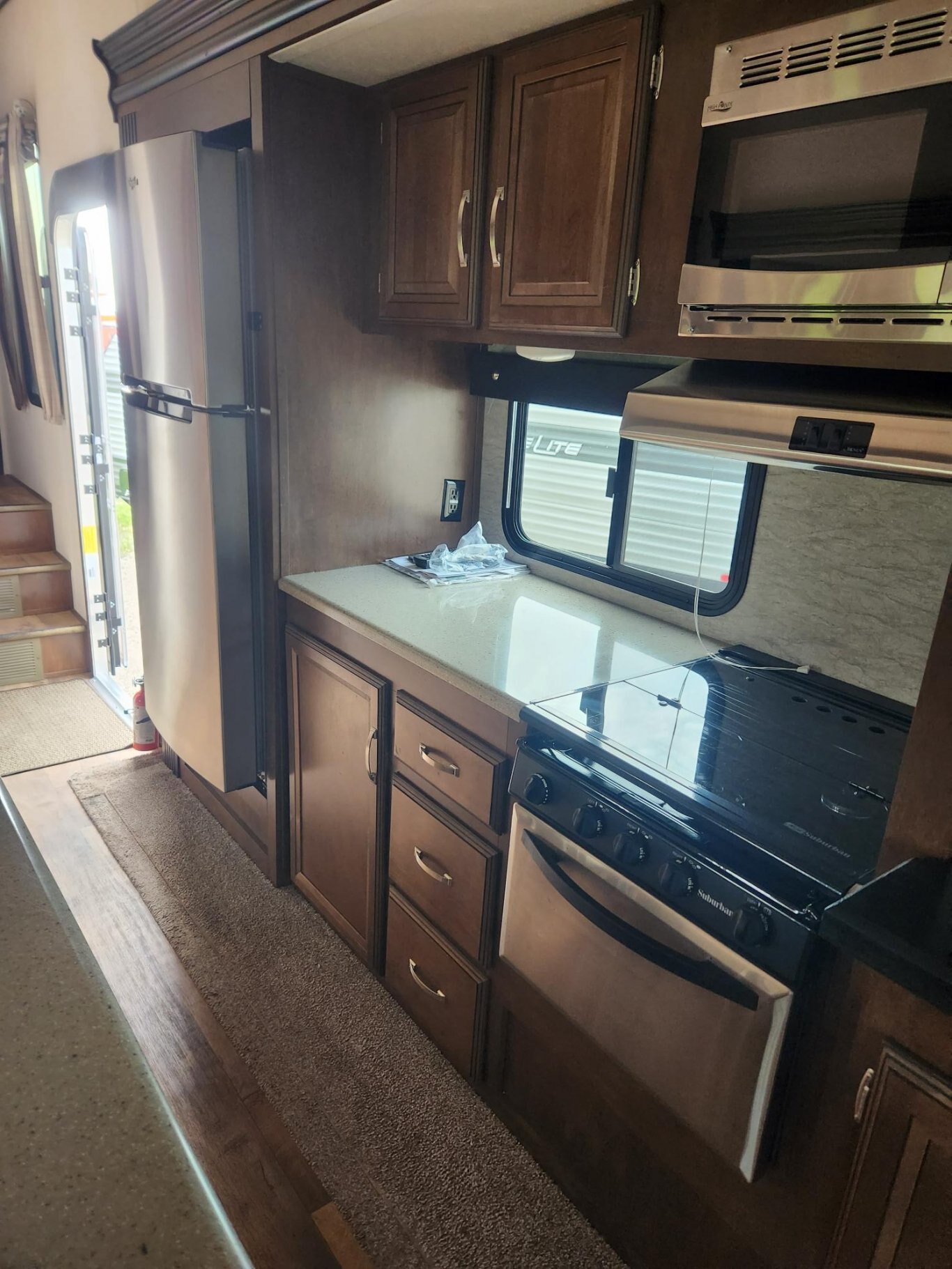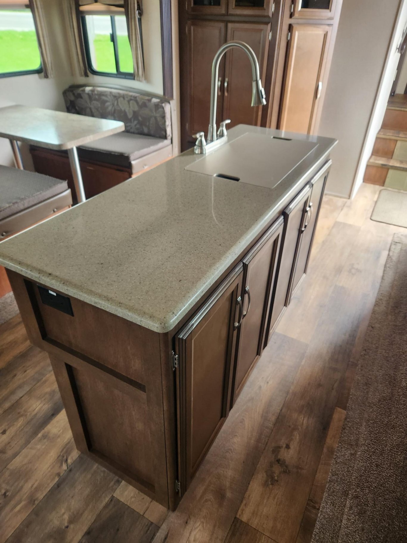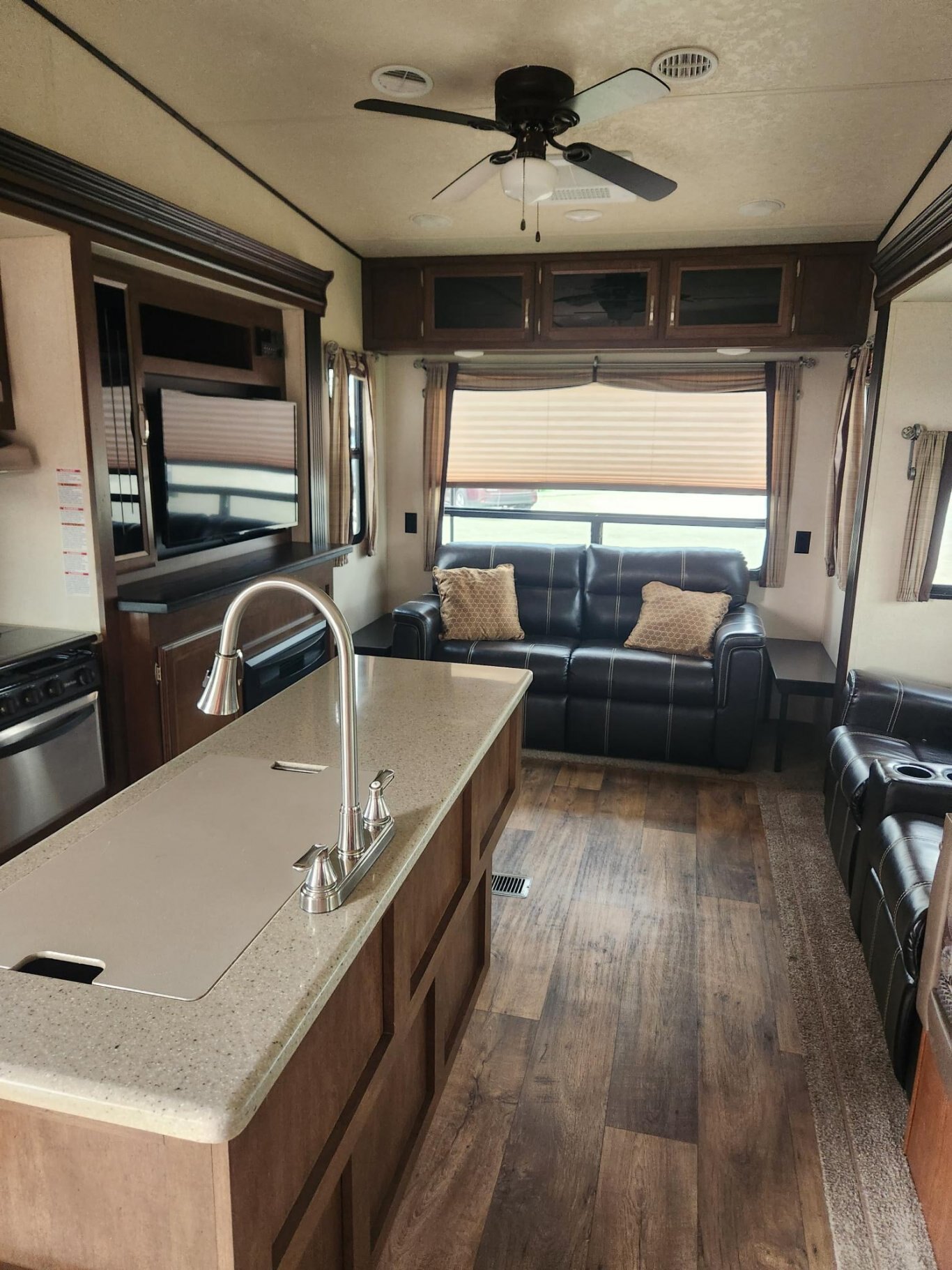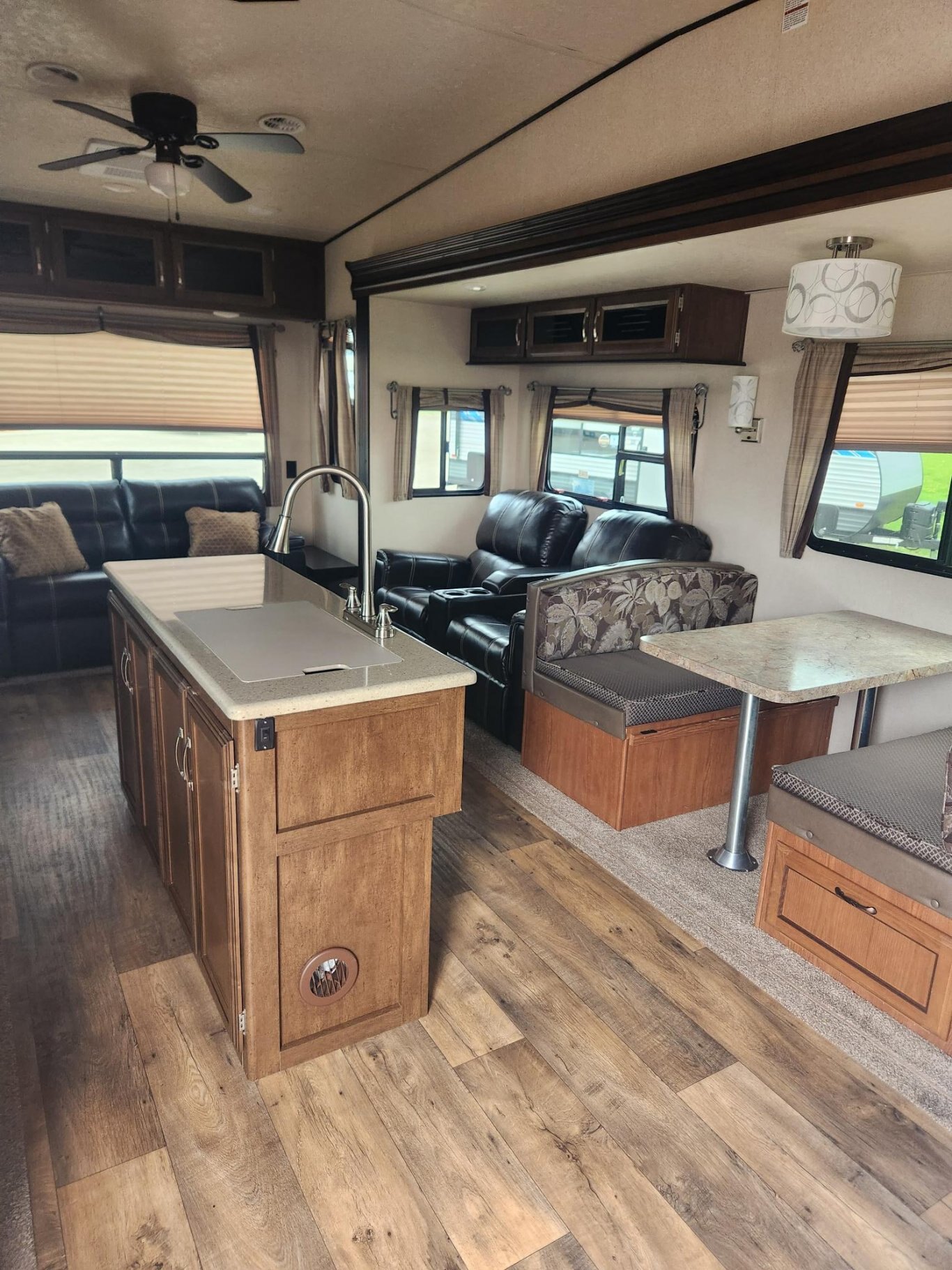 As you enter this fifth wheel, to your left there is a slide with a corner entertainment center and a free-standing table with chairs. Along the rear wall you will find two lounge chairs with a table between. The second slide in this area offers a tri-fold sofa, pantry, and refrigerator. Along the interior wall there is a three burner range and extra counter space. The kitchen sink is located in the center island.