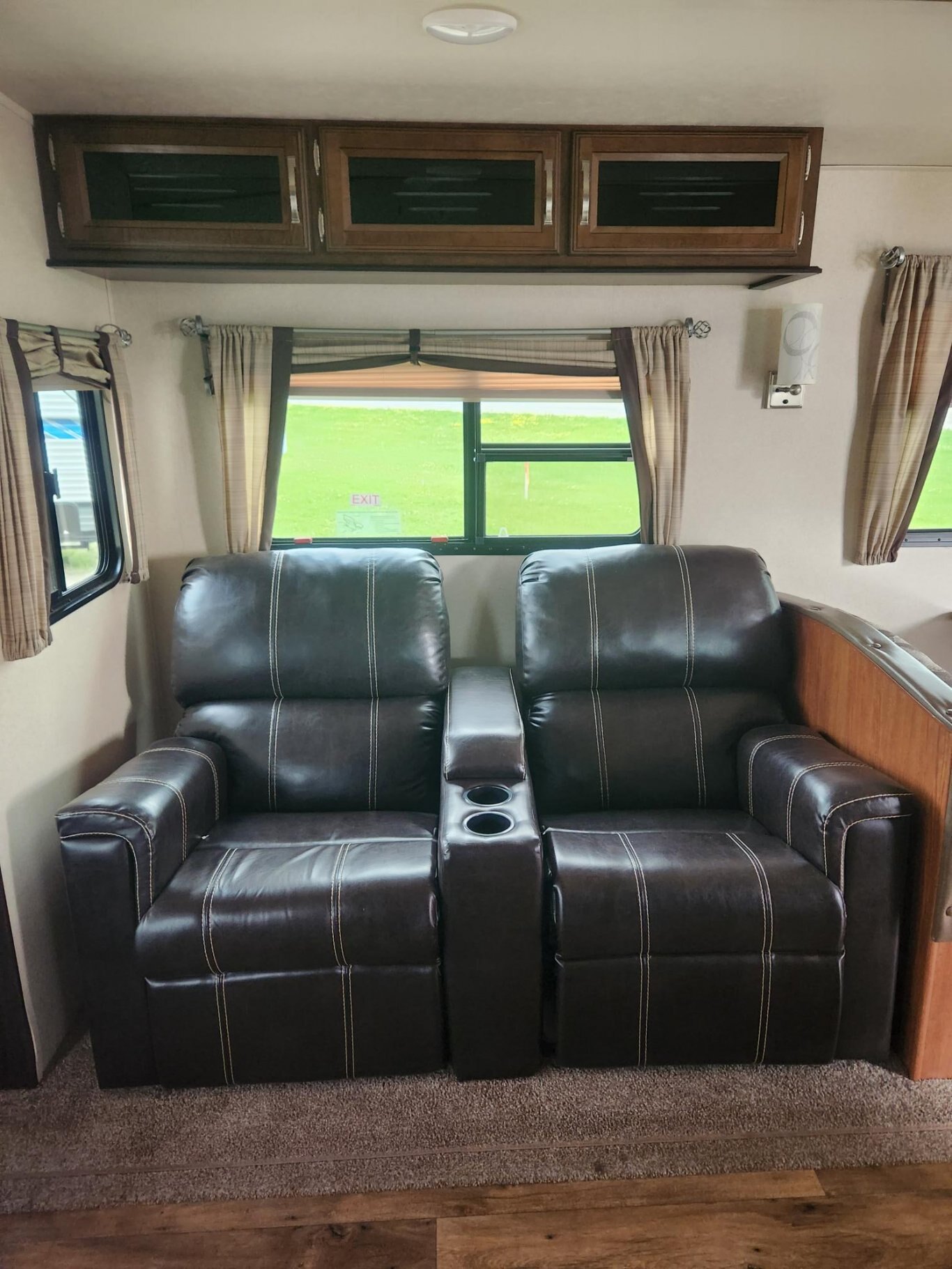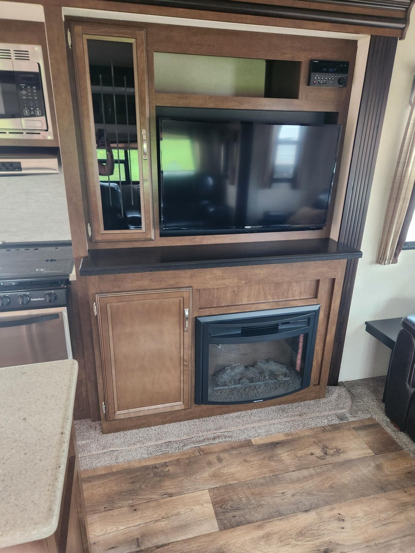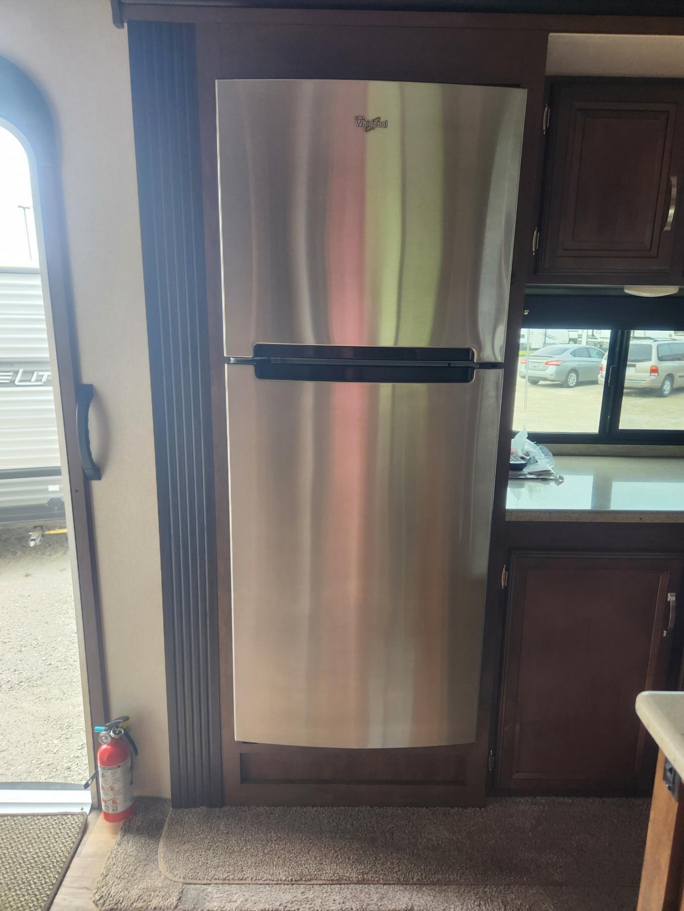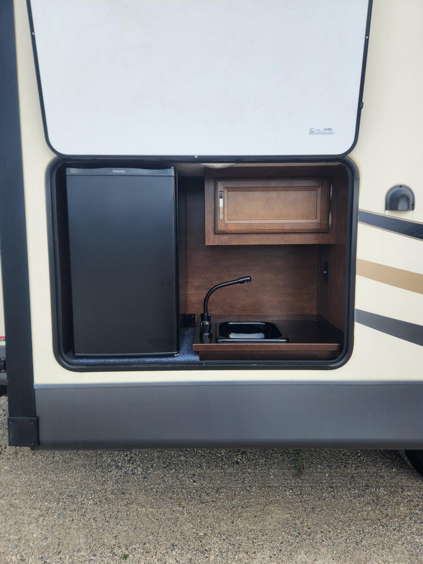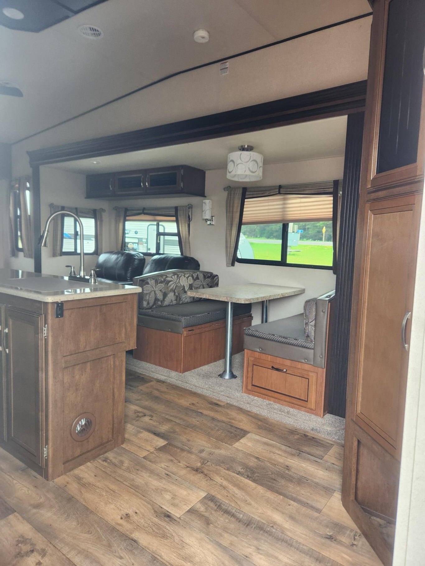 As you enter this fifth wheel, to your left there is a slide with a corner entertainment center and a free-standing table with chairs. Along the rear wall you will find two lounge chairs with a table between. The second slide in this area offers a tri-fold sofa, pantry, and refrigerator. Along the interior wall there is a three burner range and extra counter space. The kitchen sink is located in the center island.
