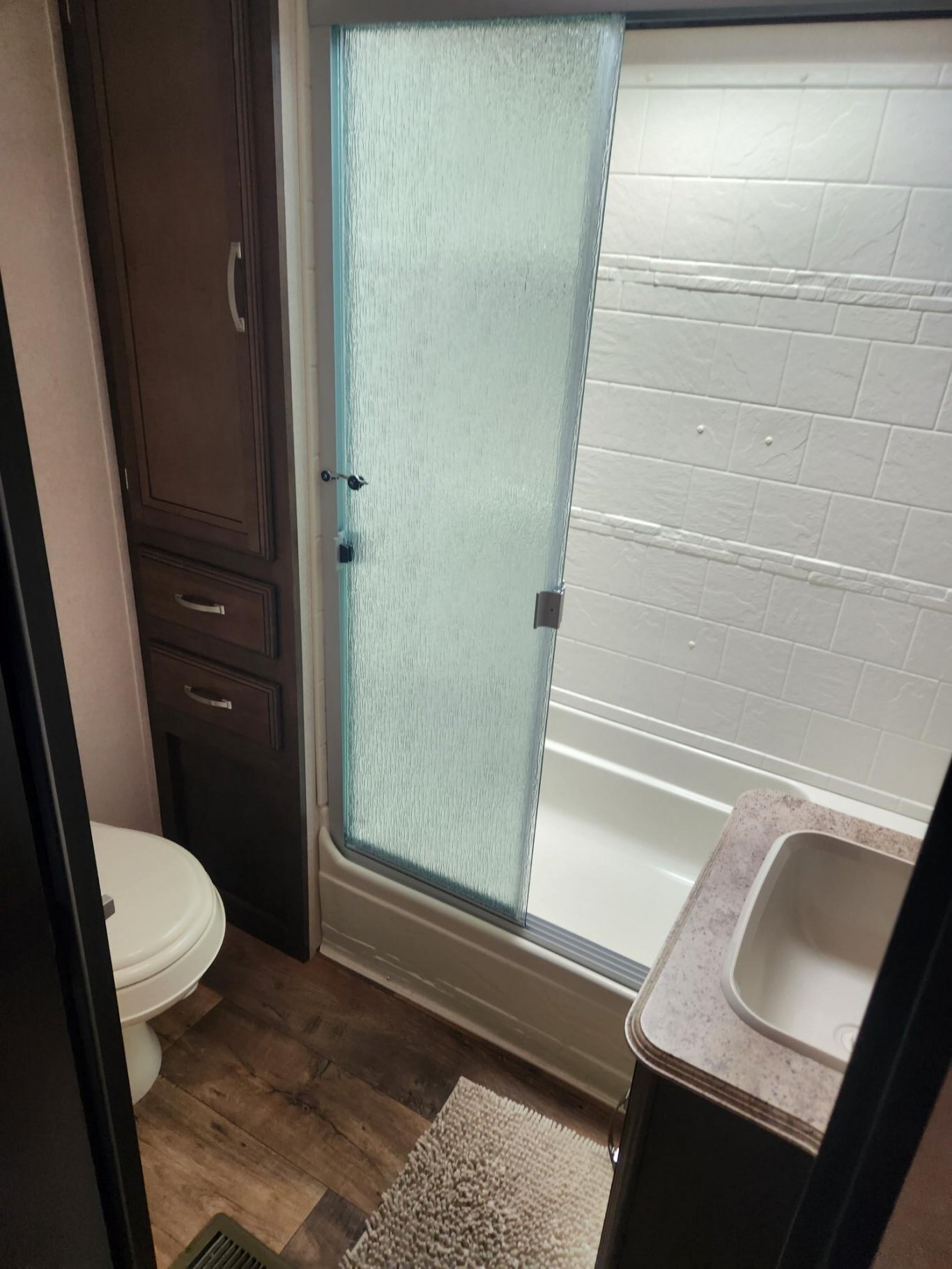 Stepping up the stairs, the side aisle bathroom is on your left. Inside the bath you will find a toilet, residential shower, sink, and handy medicine cabinet.