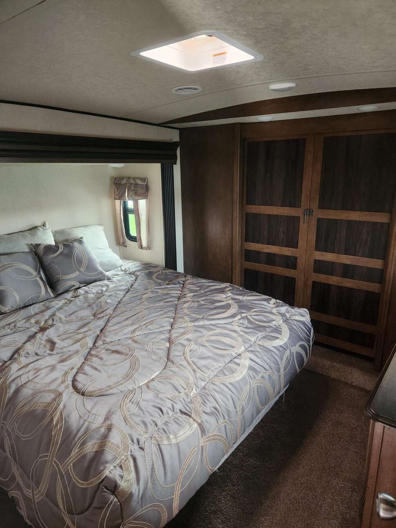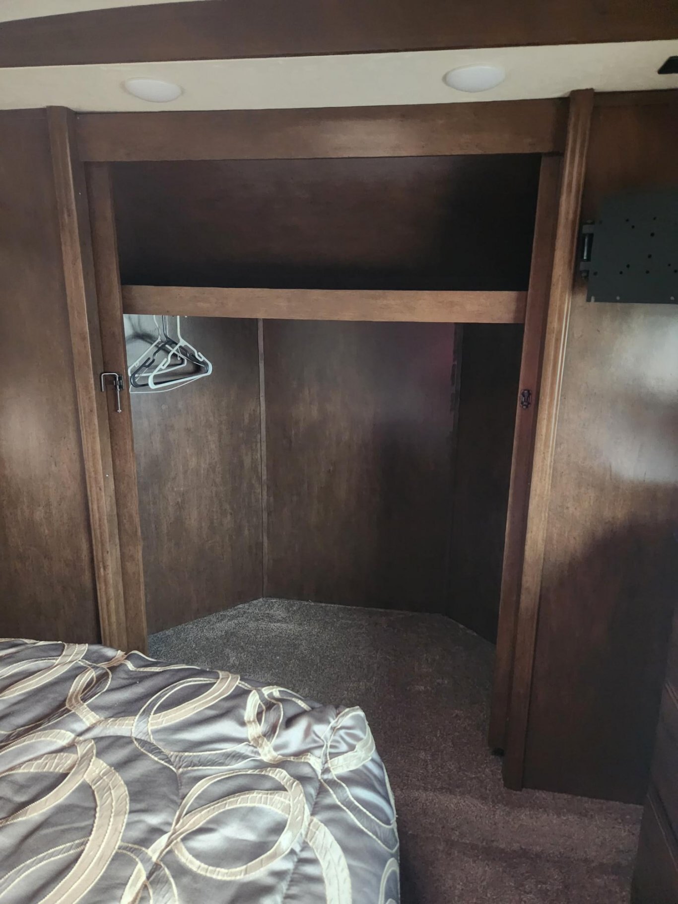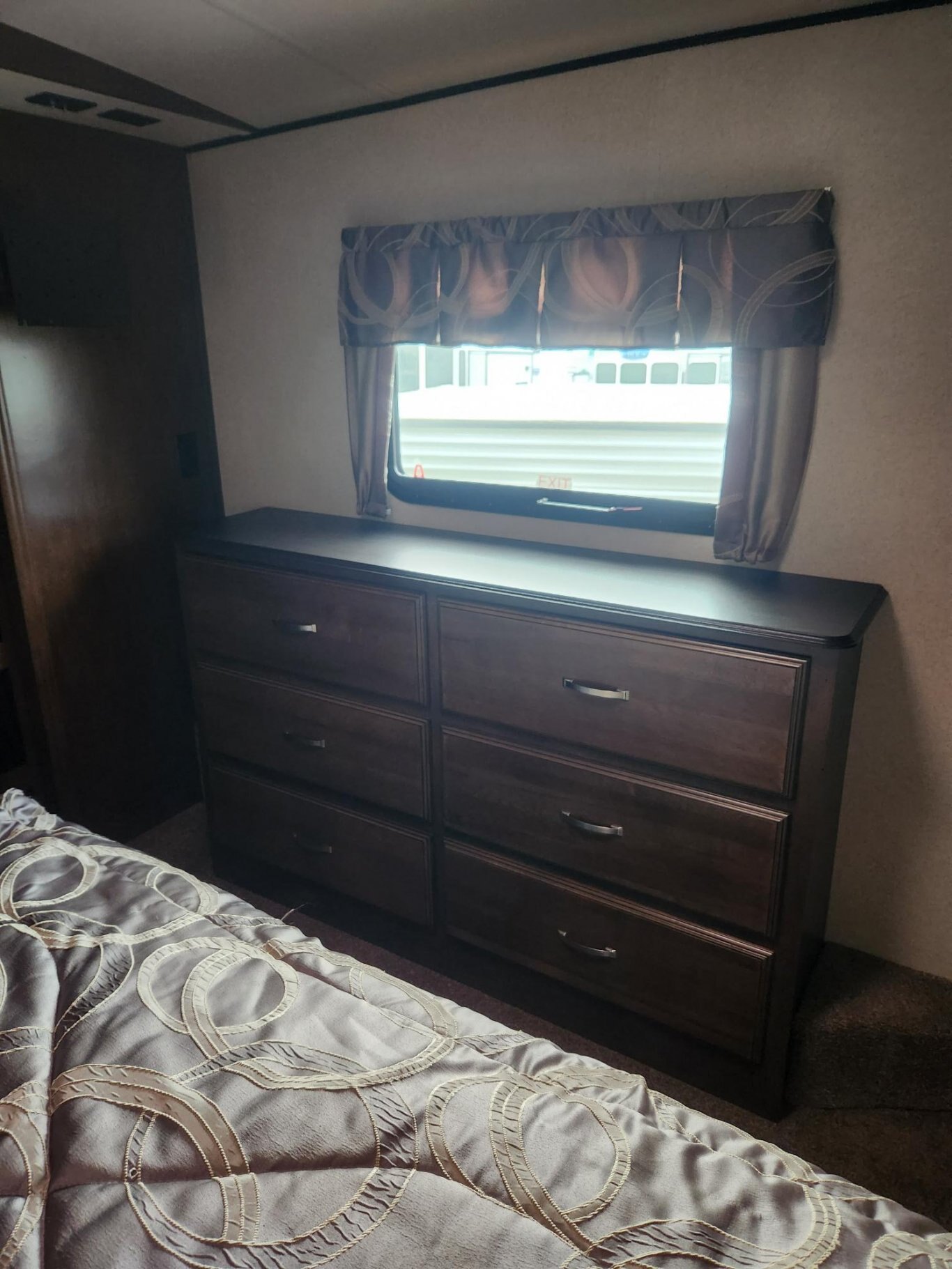 The front bedroom offers a custom king bed slide with corner shelf, full front wardrobe with shelf and optional washer/dryer prep, plus a large dresser.