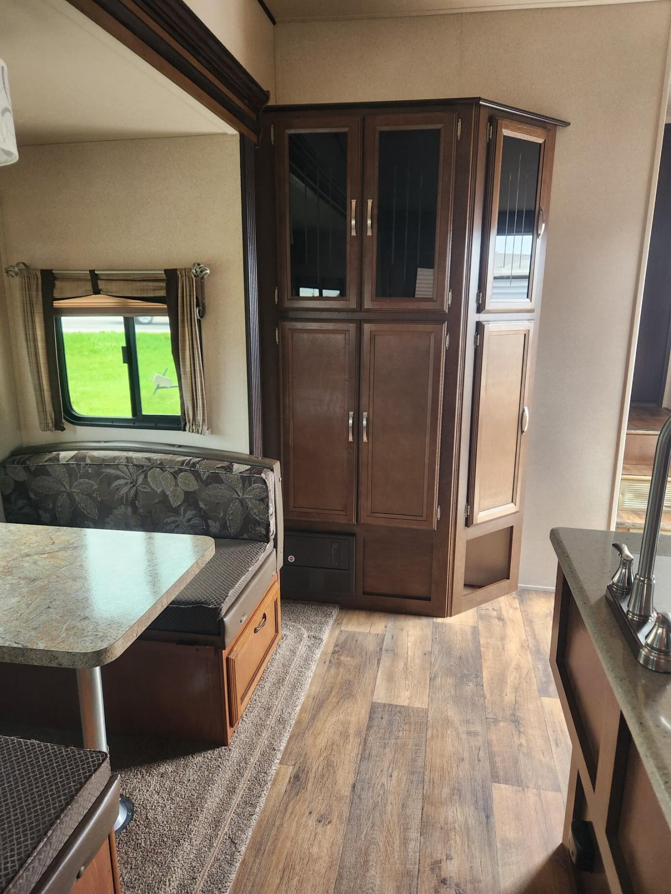 There are plenty of overhead cabinets throughout the fifth wheel for your dishes, games, and things, plus outdoor storage compartments.