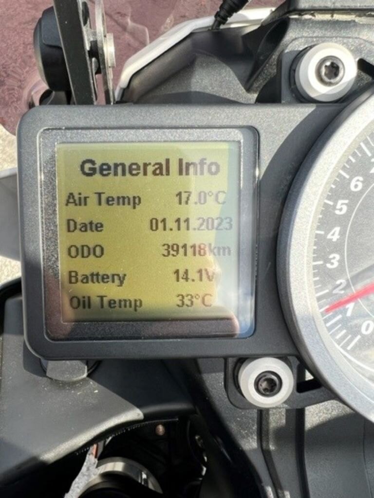 Riding conditions page for additional info, e.g. outside/oil temperature, on-board voltage, various trips, average speed, average and current fuel consumption, range, distance to next service