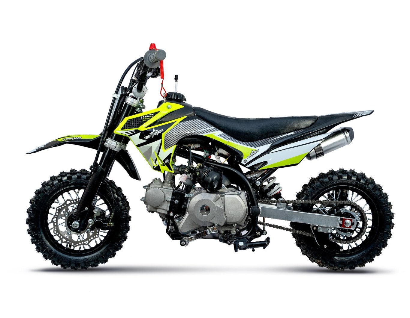 Firstly, we have applied our new mini stealth plastics which give the bike a slick look that appeals to kids and adults alike, it now matches the rest of our bikes in the lineup. We thought the power on our old bikes was sufficient, here at Thumpstar, we are always looking for that extra thump. The TSK50 has a completely new engine, which is semi automatic rather than fully automatic, has both an electric and kick start, and overall provides more power, allowing heavier junior riders. Safety on a kids bike is a must have feature, an emergency lanyard which kills the bike should your child come off, coupled with an adjustable throttle limiter, provides full parental control of the bike.