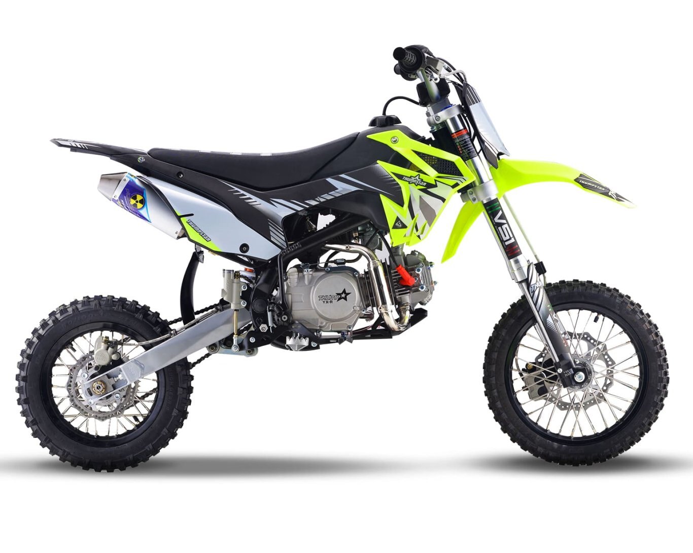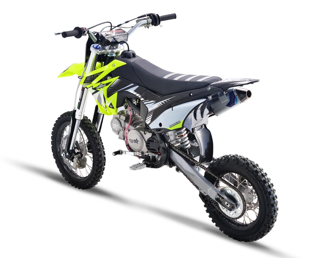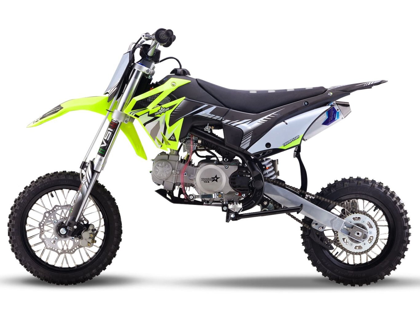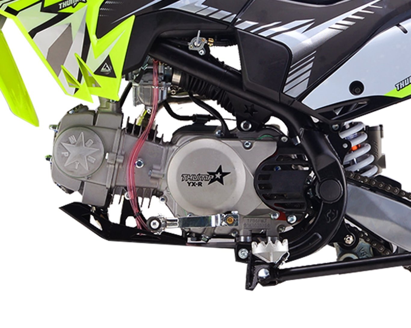 Our design team has produced a piece of engineering art. The frames are a new Quad Bar, which has made them stronger than ever. Along with the frame developments, we made space and rigged them with mounts to accommodate our new caged airboxes. This allows a better air filtration system while increasing airflow into the carburetor, and in turn, more horsepower. A first on pit bikes and minibikes alike, we have scaled down the linkage from the likes of a full-size race bike and fitted it to these smaller sized 110s. The linkage provides a much smoother ride than traditional PDS style suspension, which allows for faster cornering, high and low-speed adjustments, and increased rider comfort. We have redesigned our hubs and created space for a much heavier duty 20mm rear axle, coupled with stainless spokes and alloy rims, which provide our strongest wheels to date. Check out our description video and the following spec lists to see these upgrades!