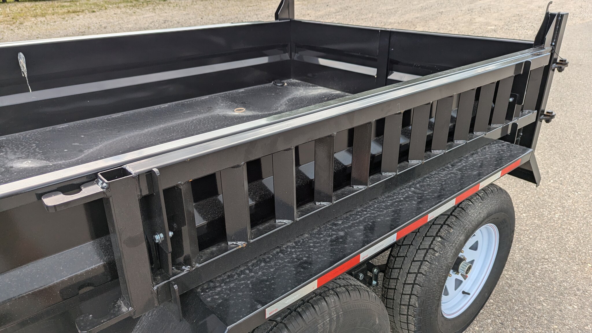 - 6x10x18\" High Sides \ 6\" Gussets - Low Profile Dump Trailer - Tandem 2x 3500 LBS - Electric brakes on one axle - Side Ramps *** Upgraded *** - ST205/75D15 Tires, 15\" x 5 Bolt - Coupler for 2-5/16\" Ball - Rear Double Door w/ Cam Lock - Shield Roll Top w/ Crank - 10 Gauge Floor Plate - 5000LB Top Wind Jack - Light Package - 12 Volt Electric Power Pack w/ Remote Control - Enclose Electrical Motor & Hydraulic Tank