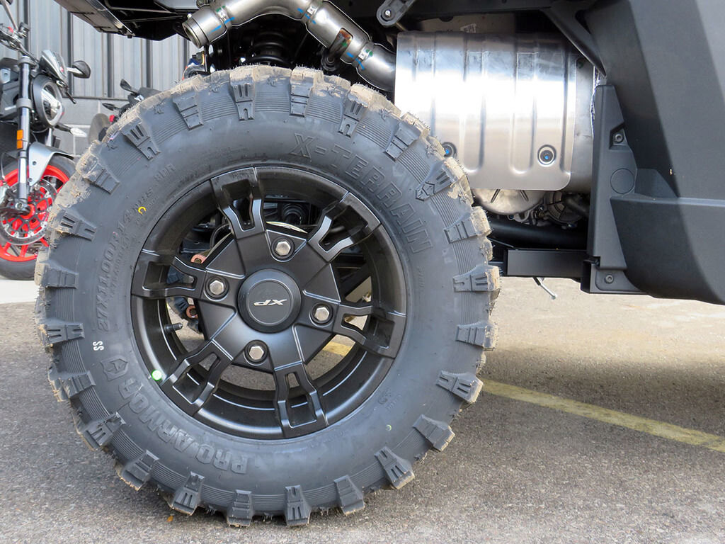 Fend off rocks, stumps, and rough terrain with a rigid one piece chassis, full-body skid plate and massive front bumper delivering maximum protection. 27\" 8-ply Pro Armor X-Terrain tires provide improved durability and a more comfortable and confident ride in tough terrain.