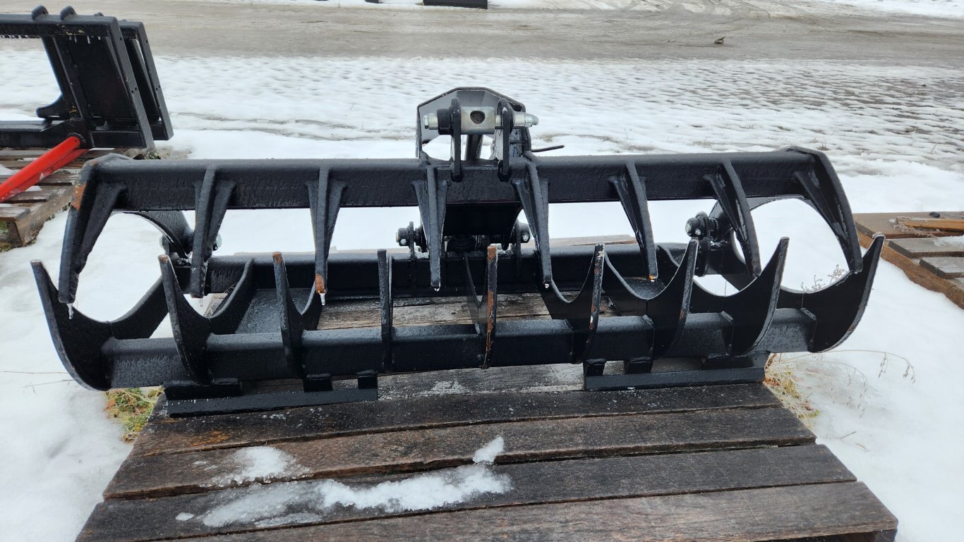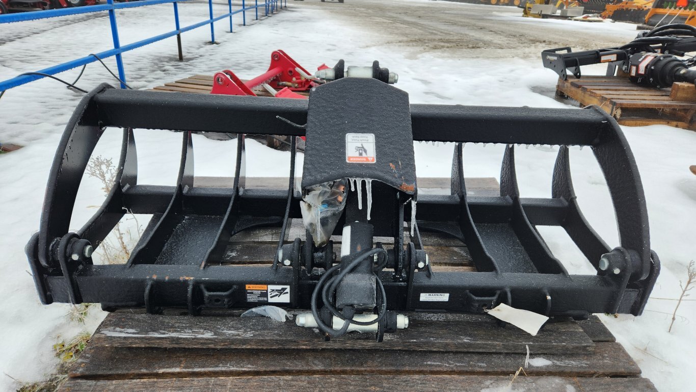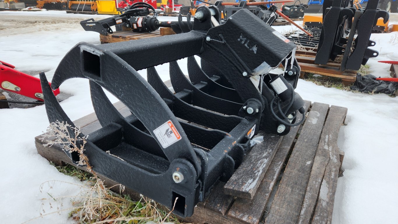 New HLA RRGLDE54BO500 root rake electric grapple, 54″ working width, 7″ center to center tine spacing, Universal skidsteer quick-attach, 12 volt electric actuator cylinder
