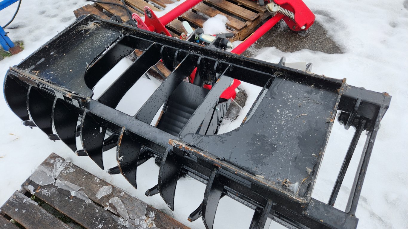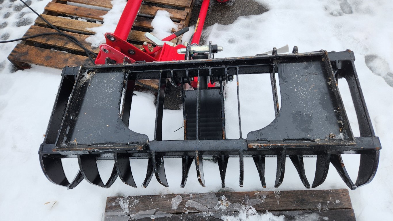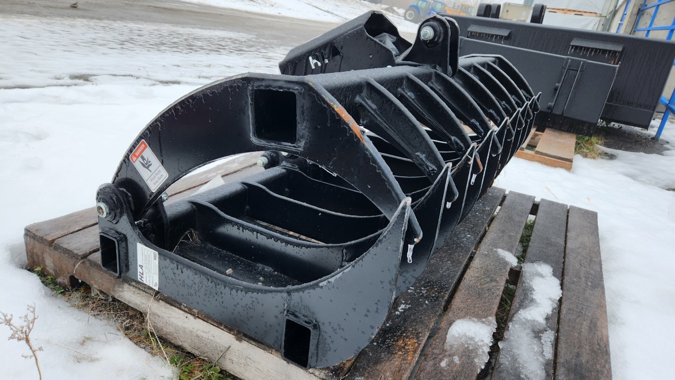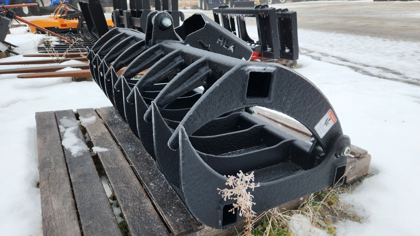 New HLA RRGLDE54BO500 root rake electric grapple, 54″ working width, 7″ center to center tine spacing, Universal skidsteer quick-attach, 12 volt electric actuator cylinder