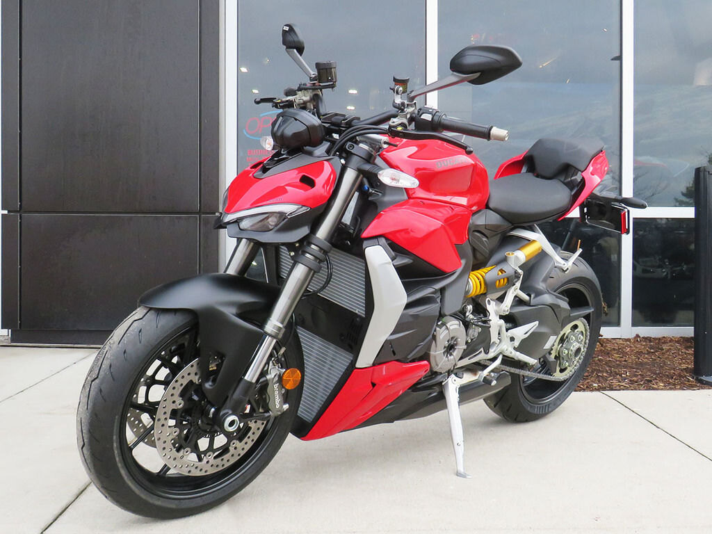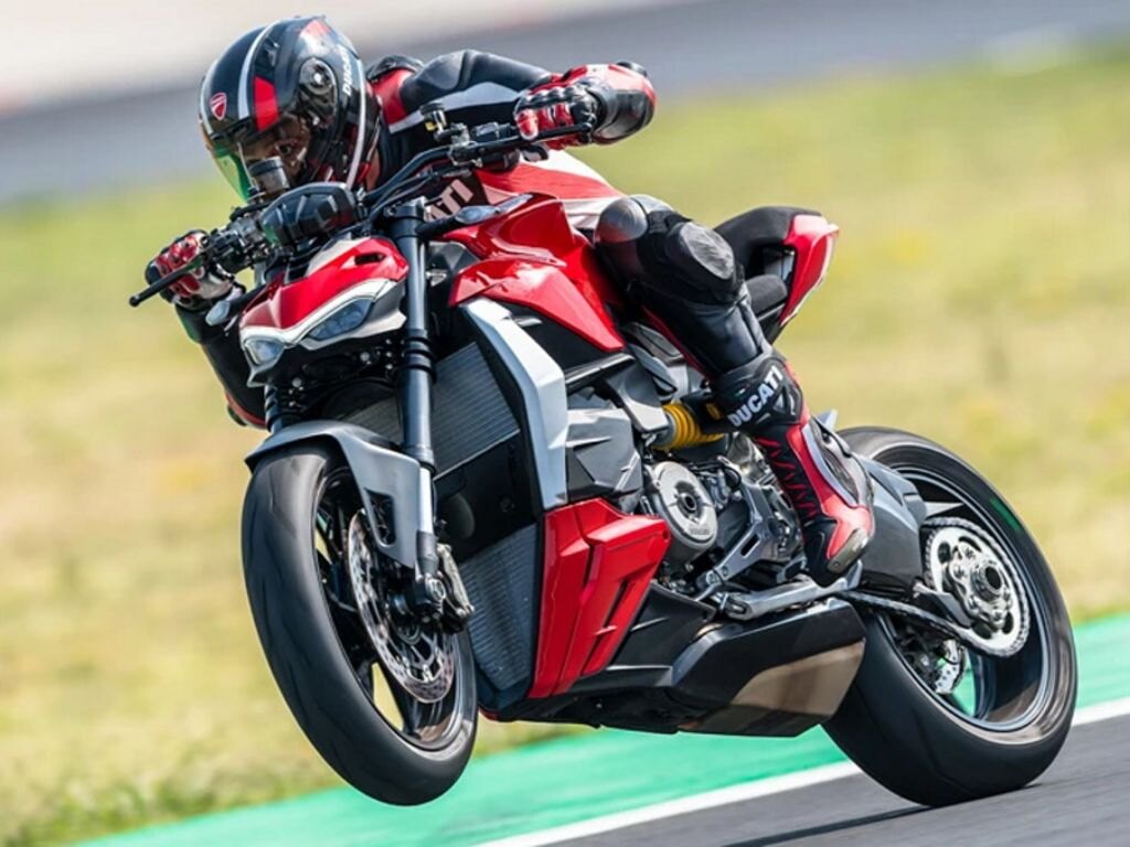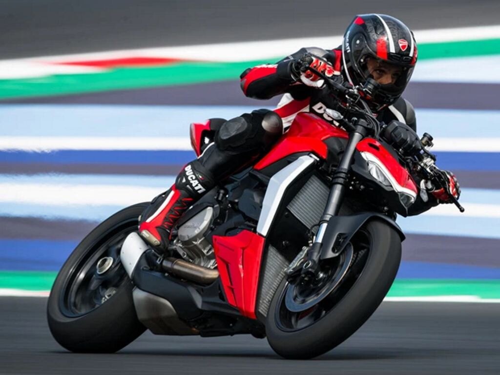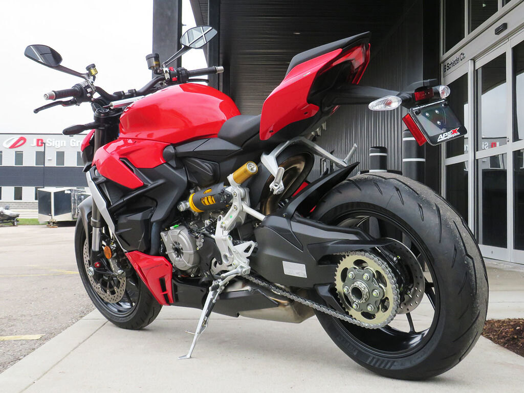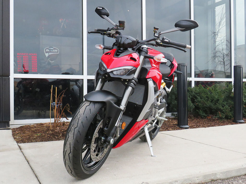 The Ducati Streetfighter V2 range includes the Ducati Red color scheme and is now expanded with the introduction of a new matte metallic green color that enhances the bike's design: Storm Green.