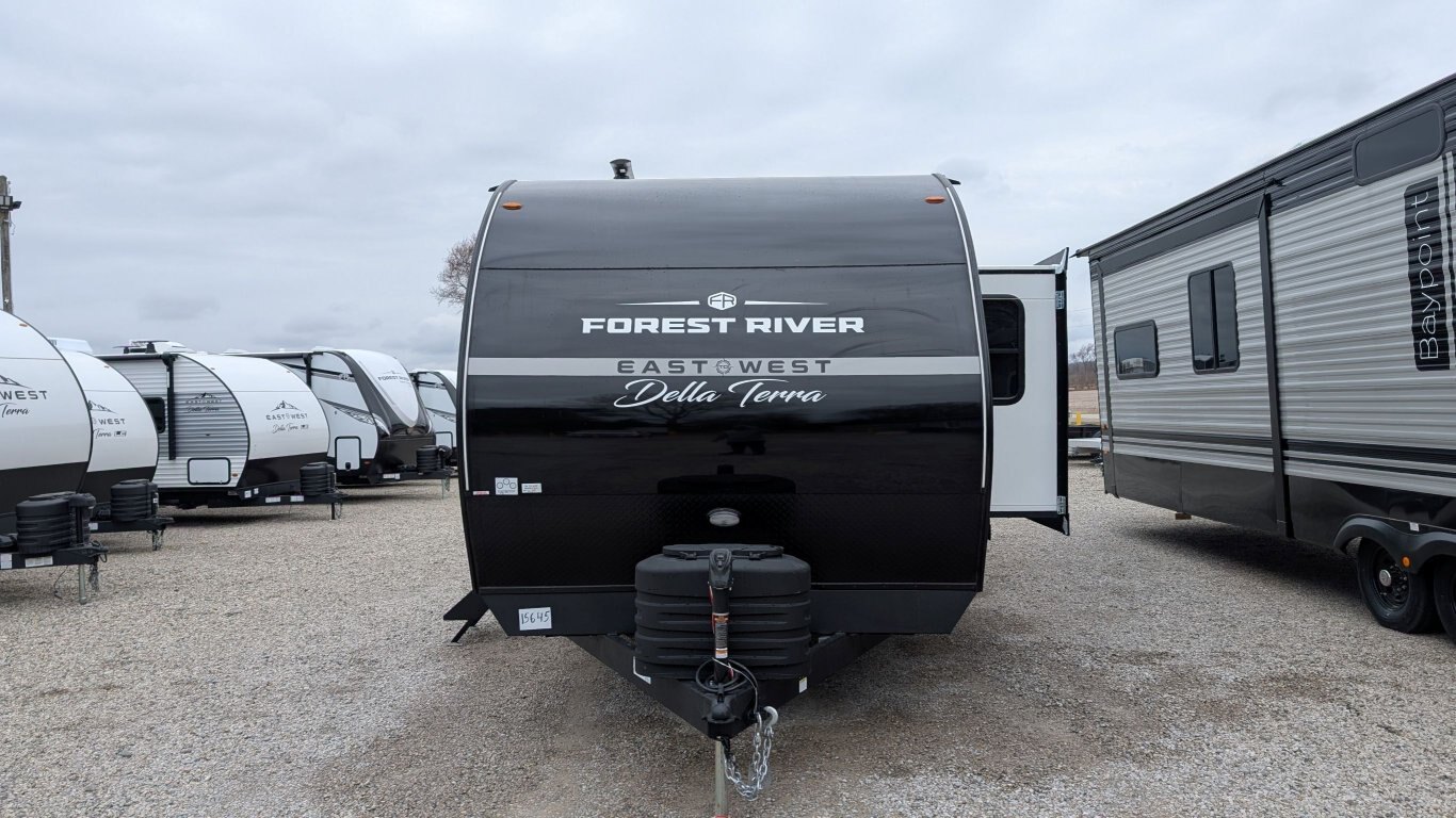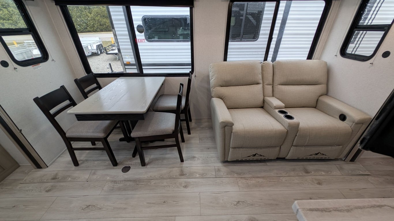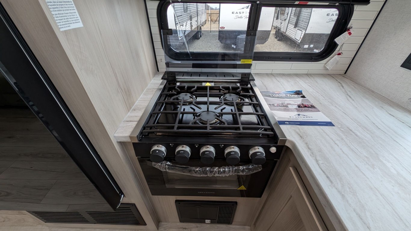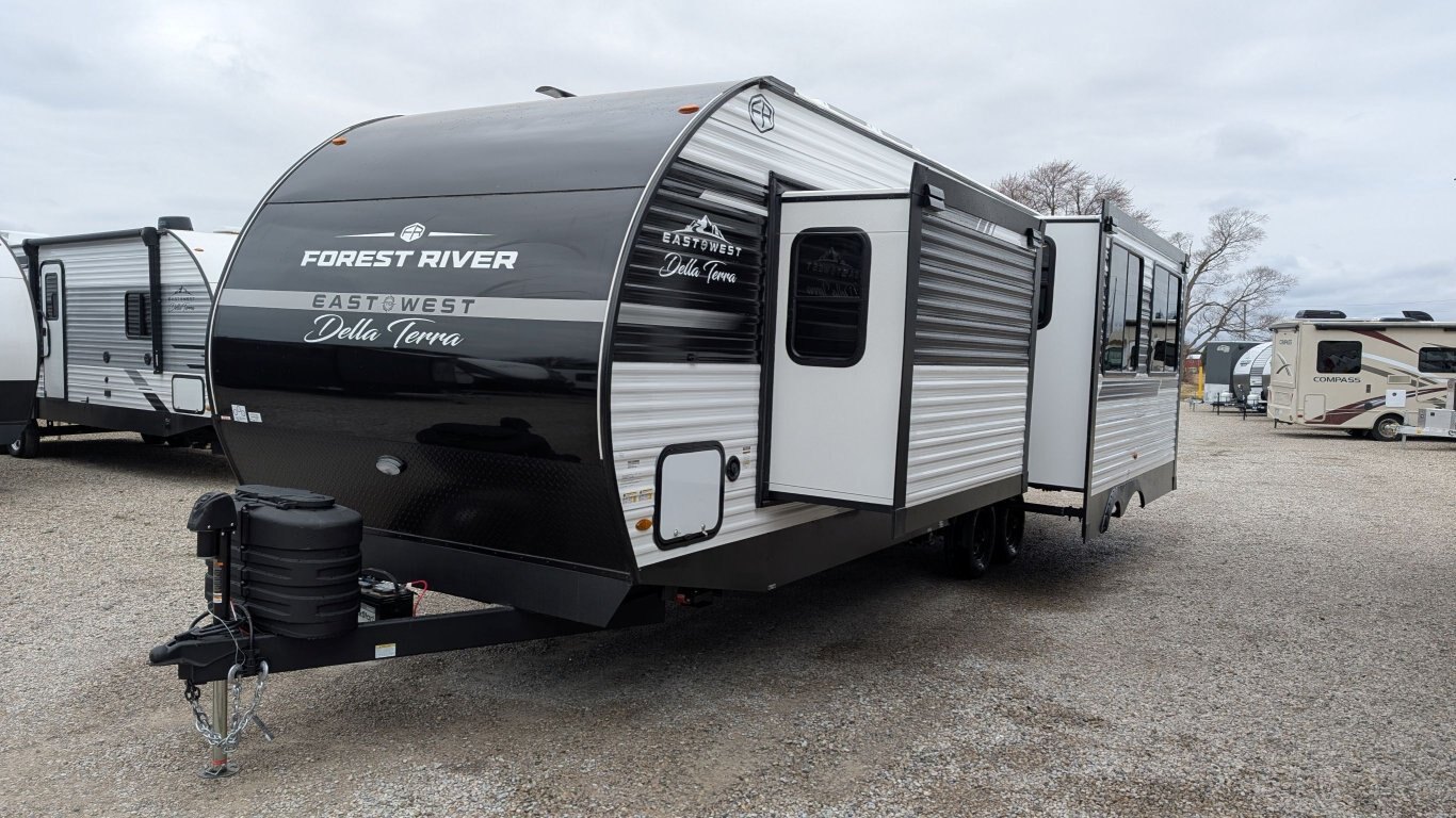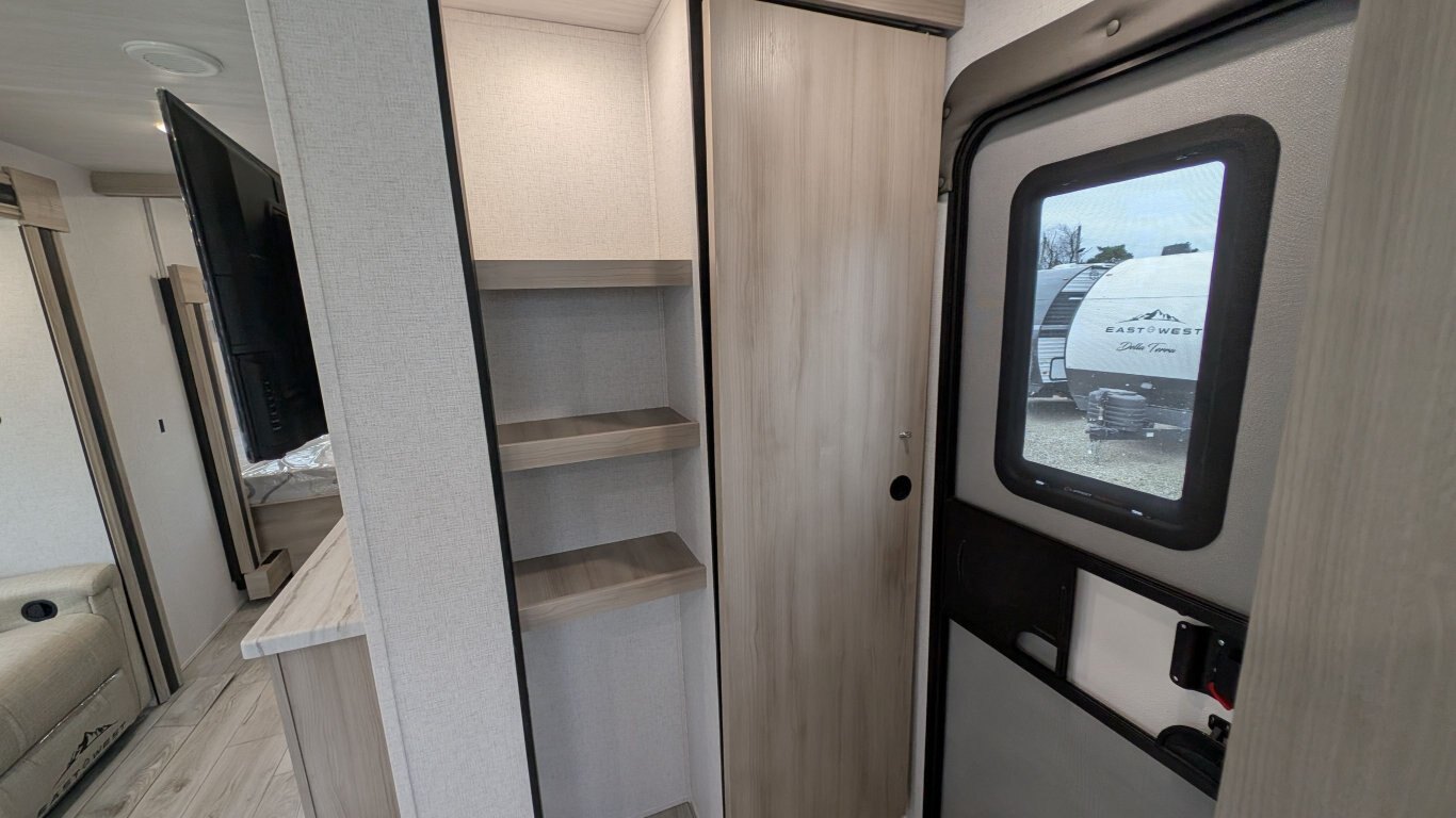 REG: $52,995 SALE: $45,995 The 2025 East to West Della Terra 263RK travel trailer is designed for comfort, convenience, and adventure. It features an 81” interior height, a king-size bed, and an upgraded interior design package featuring Odali Linen interior decor. Financing available for as low as $95/week OAC. This unit features the following options: The Explore Comfort Package includes a 10.7 cu. ft. 12V refrigerator, 3-burner range with oven, built-in fireplace, seamless pressed countertops, porcelain foot flush toilet, and a 35,000 BTU furnace. Enjoy large tinted picture windows, USB charging stations, LED lighting, and a solid bedroom door. The Adventure Outdoor Package enhances functionality with a universal docking station, tankless water heater, power awning with LED lighting, outside shower, backup camera prep, solid entry steps, solar prep, and an RV grill quick disconnect. It also includes a black tank flush, power tongue jack with LED light, and a detachable power cord. The Base Camp Package adds durability and efficiency with automotive deposition coating, heated and enclosed holding tanks, flush floor slides (no carpet), a 15,000 BTU ducted A/C with Quick Cool, and magnetic baggage door catches. Additionally, this unit comes with a 40” Smart TV, electric power stabilizer jacks, 200W solar package, Theatre seating, a free-standing dinette, and a spare tire and carrier for added peace of mind.