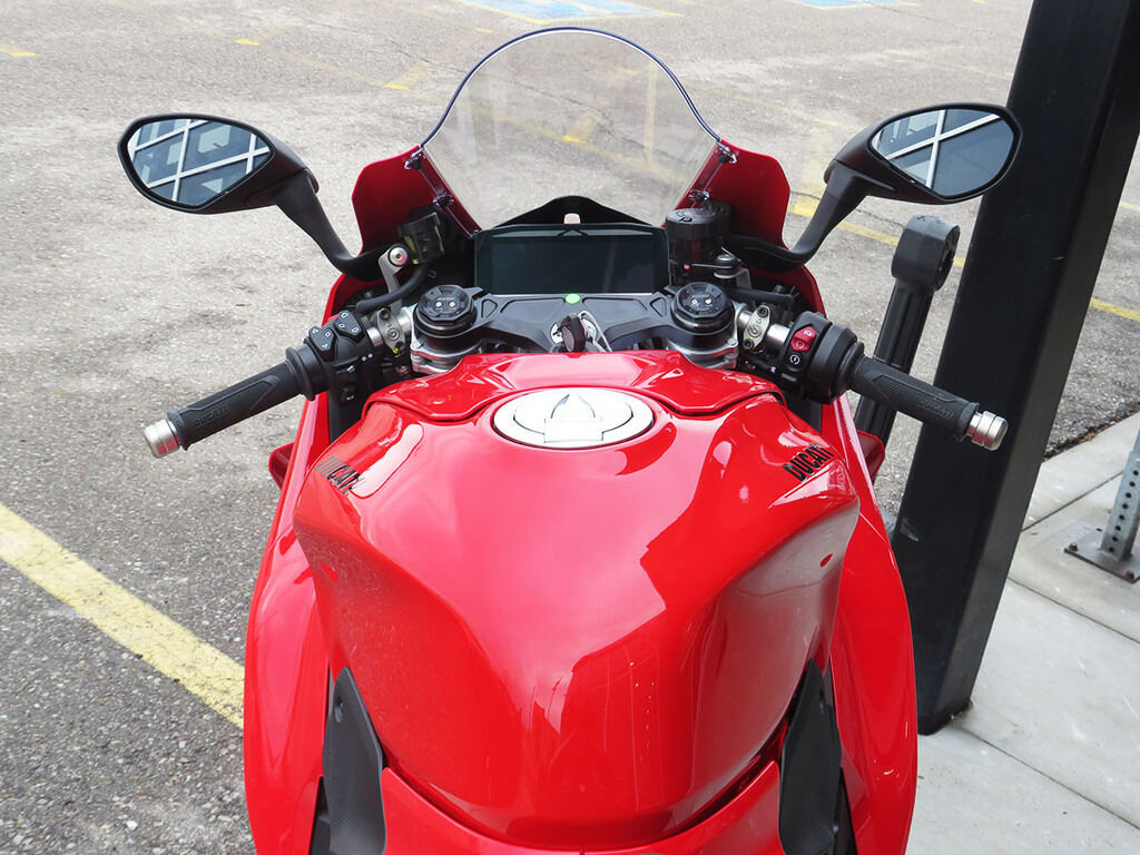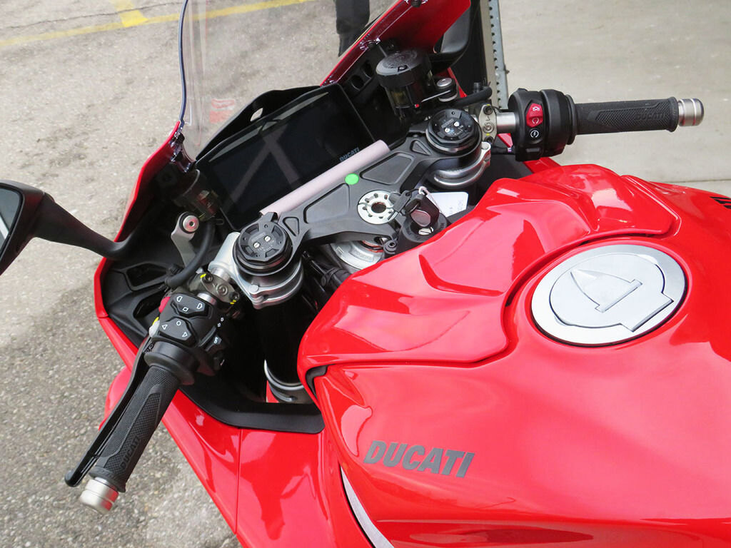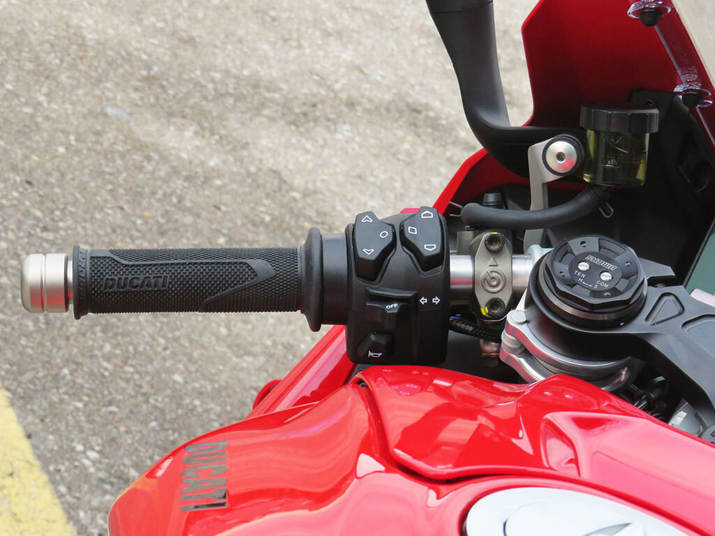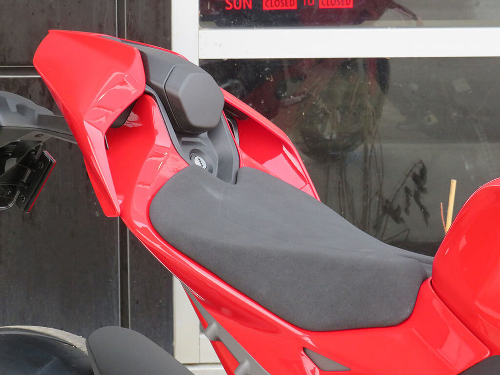 ERGONOMICSThe main changes regard the contact points between motorcycle and rider and the position in the saddle. Tank, footpegs and seat fit area have been completely revised with the aim of heightening control in the most important phases of track riding and allowing the rider to fully exploit the performance of the Panigale V4 both over a single lap and during an extended session.