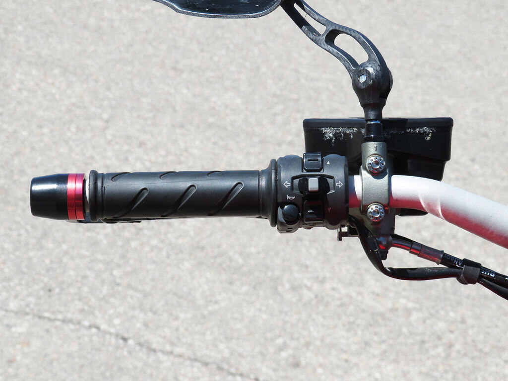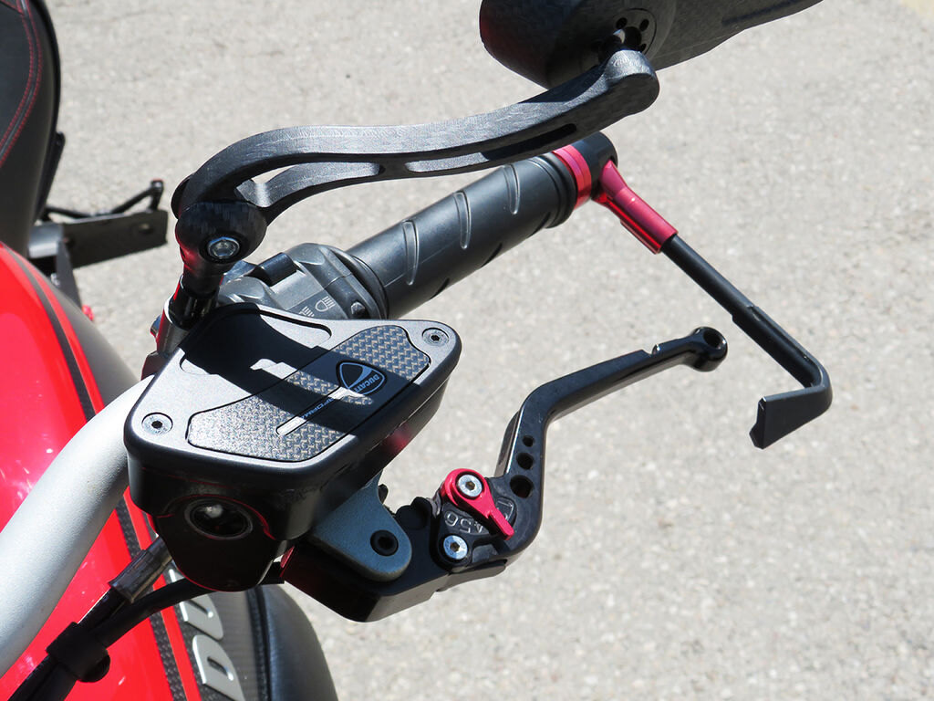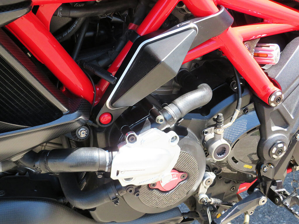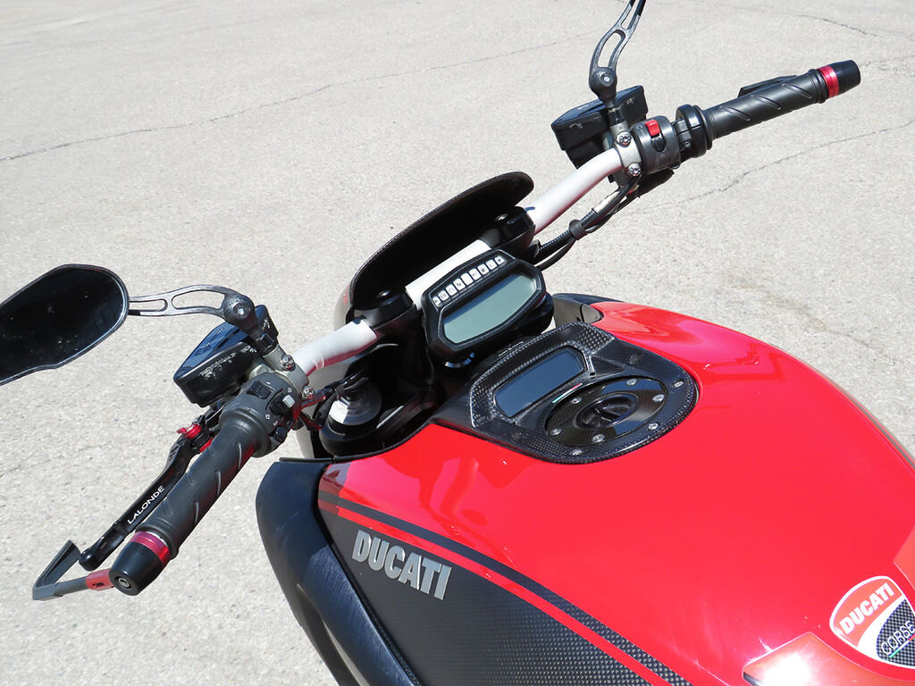 This Diavel Carbon has been well-loved and it shows. The Italian brawler has been dressed up with a Ducabike clear clutch cover, Rizoma frame sliders, Koso mirrors, clutch and front brake lever protectors (with adjustable aluminum levers), billet footpeg mounts, custom aluminum water pump cover, carbon-fibre windscreen, accessory fuel cap, and many anodized and carbon accents. A real treasure for Diavel fans!