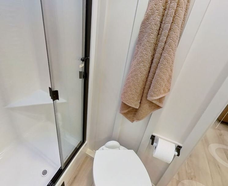 - Spacious Bathrooms with ample counter space, a porcelain toilet, and a large 30″ x 42″ one-piece molded fiberglass shower with an integrated seat