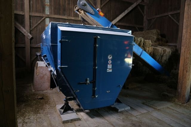 Horizontal four auger mixers in a stationary version with capacities from 150 to 750 cubic feet. The mixing augers are driven by electric motor, the door can be manually operated or electric driven. All models are available with or without scales. The heavy duty horizontal four-auger design are capable of giving the mix required, from rations with well cured, long stemmed legume-type hay, to mixes with green grass, and mixes with silage and commodities. Better milk production, better weight gains and greatly improved animal health are just some of the results of a finely-tuned feed ration. |