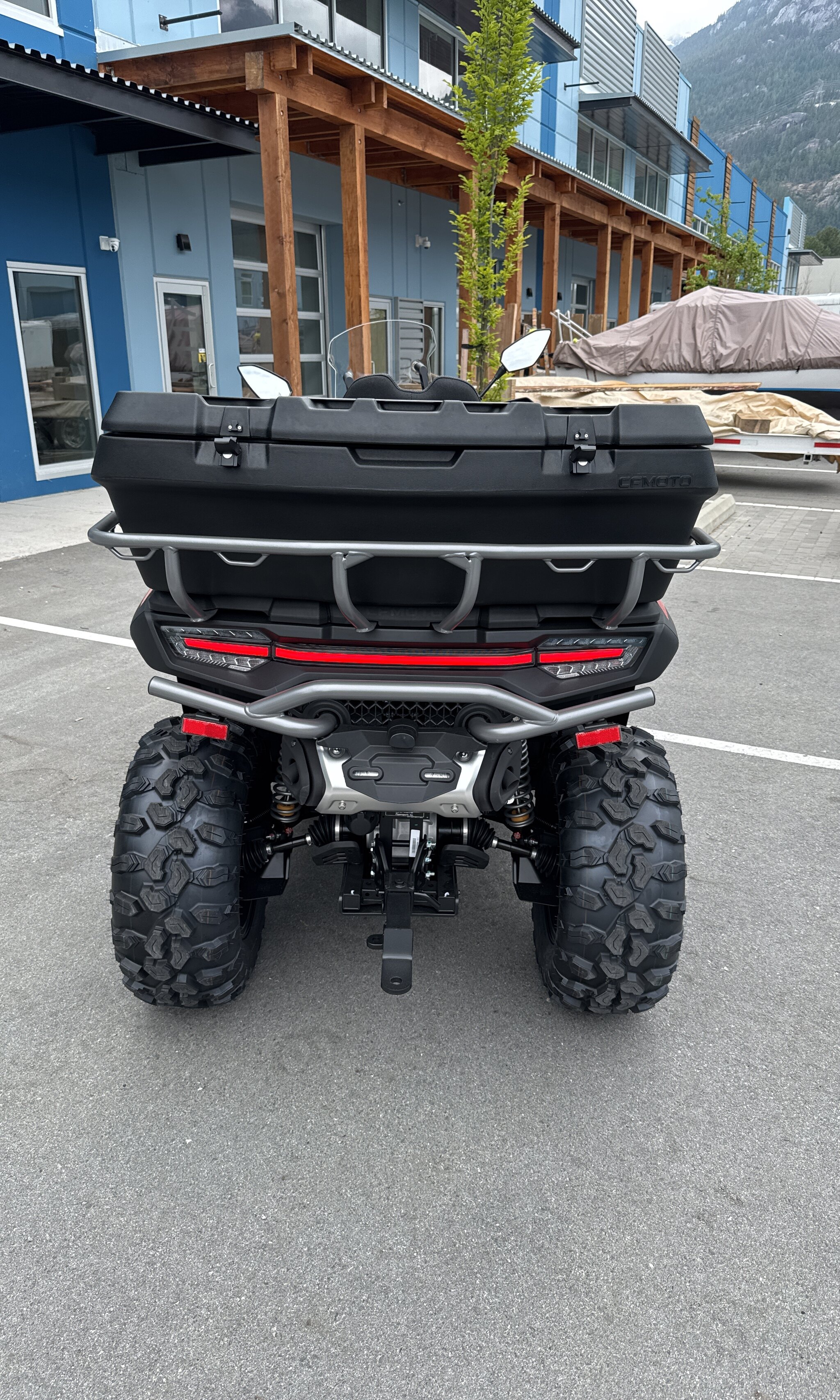 Engine Type: V-Twin cylinder, liquid-cooled, SOHC, 8-valves, 4-strokes Displacement: 963 cc Bore x Stroke: 91 x 74 mm (3.58 x 2.9 in) Engine Cooling: Liquid Fuel System: Fuel injected engine Starting System: Electric Front Suspension: Double A-arm independent, gas shock absorber with adjustable rebound/compression Front Travel: 225 mm (8.8 in) Front Brake Type: Four wheel brake disc Front Tires: AT 27 x 9-14 Rear Travel: 225 mm (8.8 in) Rear Suspension: Independent trailing arm, fully adjustable, gas shocks Rear Brake Type: Four wheel brake disc Rear Tires: AT 27 x 11-14 Dry Weight: 460kg (1014 lbs) Front Rack Capacity: 45 kg (99 lbs) Rear Rack Capacity: 90 kg (198 lbs) Towing Capacity: 800 kg (1764 lbs) Fuel Capacity: 26 L (6.8 gal) Ground Clearance: 300 mm (11.8 in) Machine Dimensions (LxWxH): 2345 x 1264 x 1450 mm (92.3 x 49.7 x 57 in) Wheelbase: 1480 mm (58.3 in)