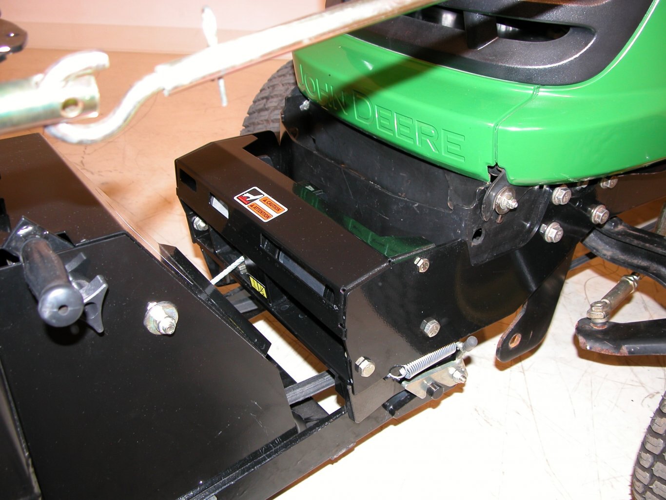 - Once the bolt-on-brackets are mounted to the tractor, they may remain on permanently with no interference with the mower deck.