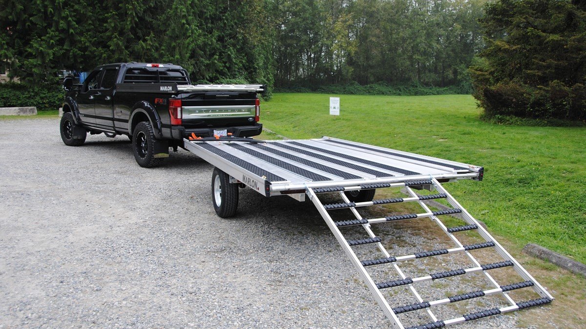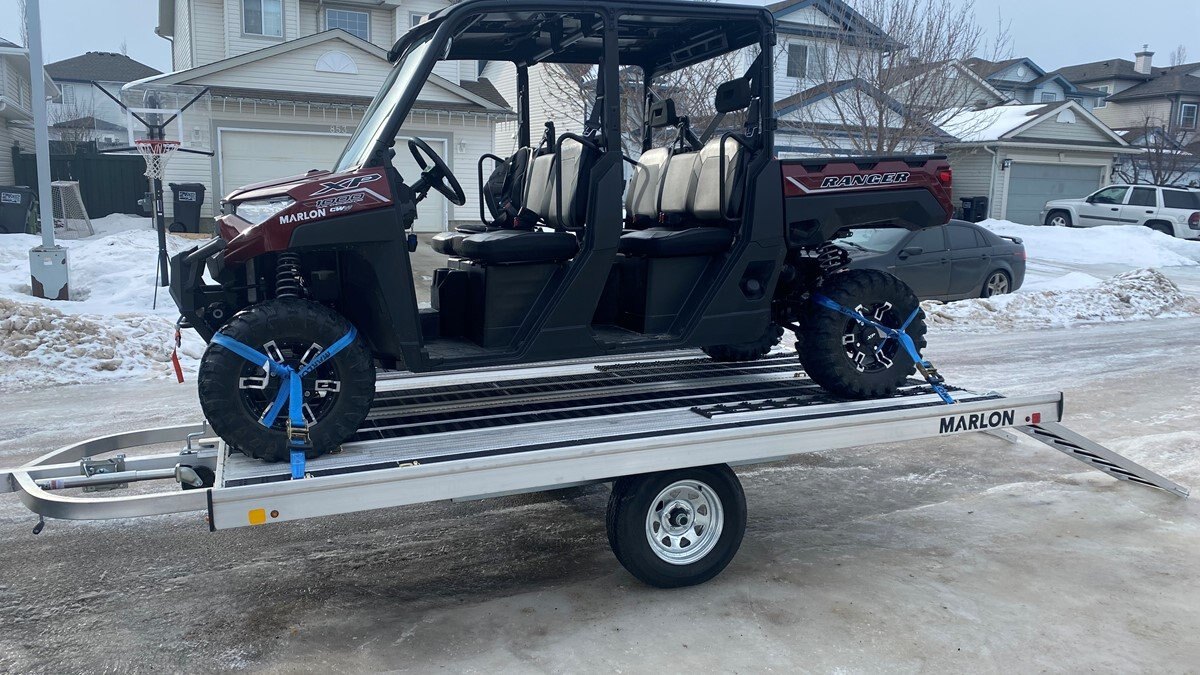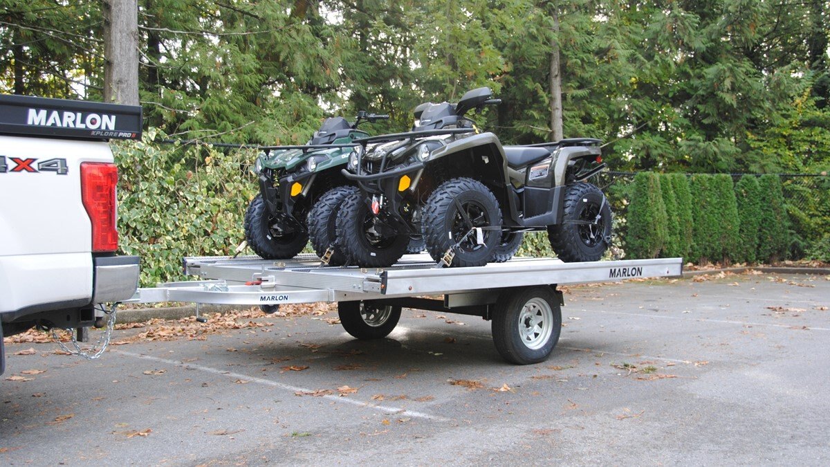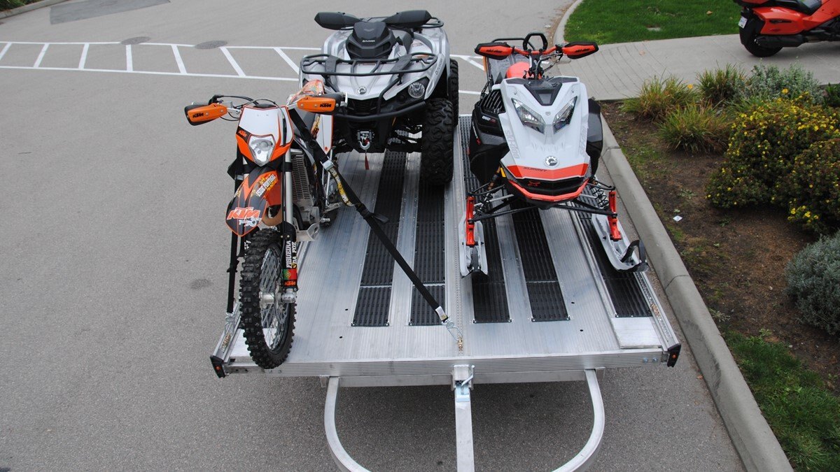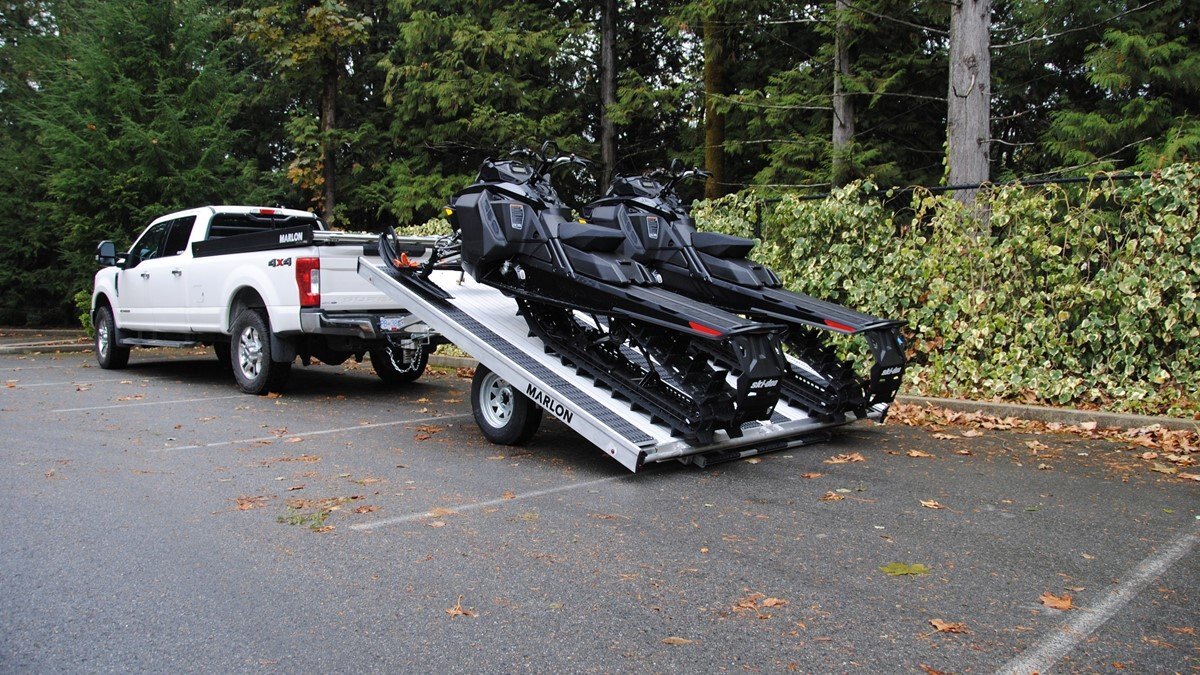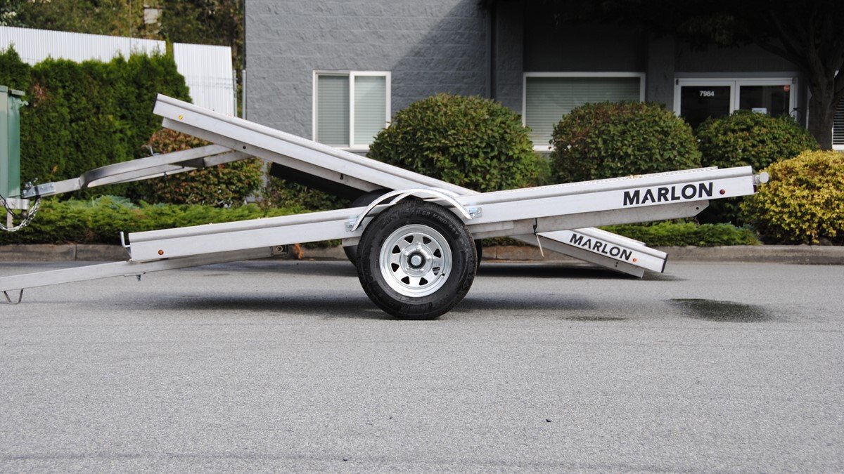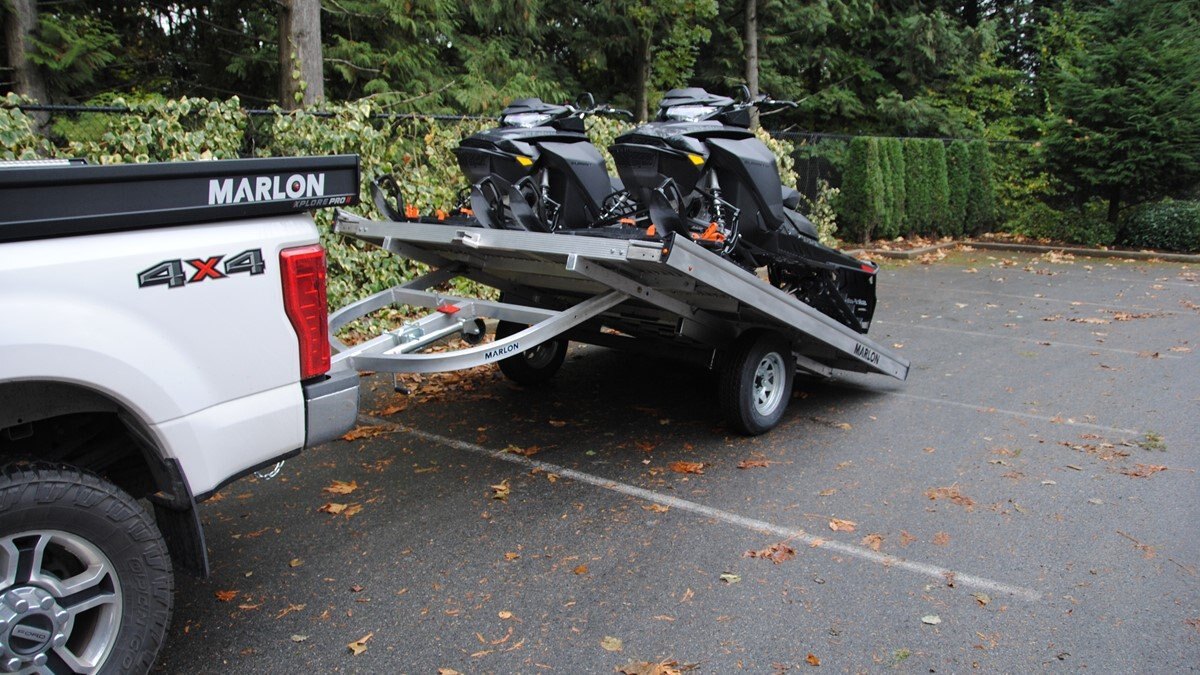 The Marlon New Product development team sat down with the goal of developing a trailer that would do more, could be used for Multiple uses and could be used in Multiple seasons. Development code name was MultiFunctional Trailer. We wanted it lite so it can be towed behind a selection of vehicles to haul your sled, ATV, Trailer SxS, stack of wood …………that’s why it is all aluminum! The sled industry needs a wide trailer for the larger trail machines and a narrow trailer for mountain sleds. We used our experiences and knowledge from 20+ year’s in the sled deck industry and adapted the slide out sides to work on our new Multifunctional two place trailers. Tilt trailer or drive on back off – it’s your call our trailer does both! We also developed a drive on drive off trailer and did but then asked why? Why because the drive on drive off trailer was brought to the industry many years ago when sleds did not have reverse, It adds cost for the additional 2’ of “V nose” decking that is not used and takes up more valuable storage area. We studied users and found that most now reverse off of their trailer because there is no room to the side of their truck in parking lots, we also found they need the rear ramp to drive back on so why not just back off. Why not spend the extra time taking down and putting up the front ramps when you could be going for a beer after a great day exploring! But we wanted more…. And we wanted to be the best and to grow the declining sled trailer business so we kept this in mind and looked for things we could do from the ground up. Extruded sides which you may recognize from our sled decks. With tie down points down the entire side at a 45 degree angle allowing you to tie down dirt bikes, various items you may carry from the lumber yard or to the dump or your ATV or side by side using our tire tie downs. Center extrusion allowing you to tie the center of the trailer items like dirt bikes and ATV’s, lumber and things that need to get to the cottage. Slide out sides as mentioned earlier and aluminum decking. The pure strength of the aluminum extrusion vs. a thin sheet of plywood allows you to tie down items such as ATV’s and not worry about the tires sinking into the plywood and straps coming loose while driving in a thunderstorm – confident that there is no plywood stretching because it has become wet. Our trailer has been designed for all seasons and to meet your needs. It can be used for your current and future toys! |