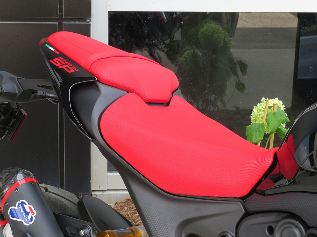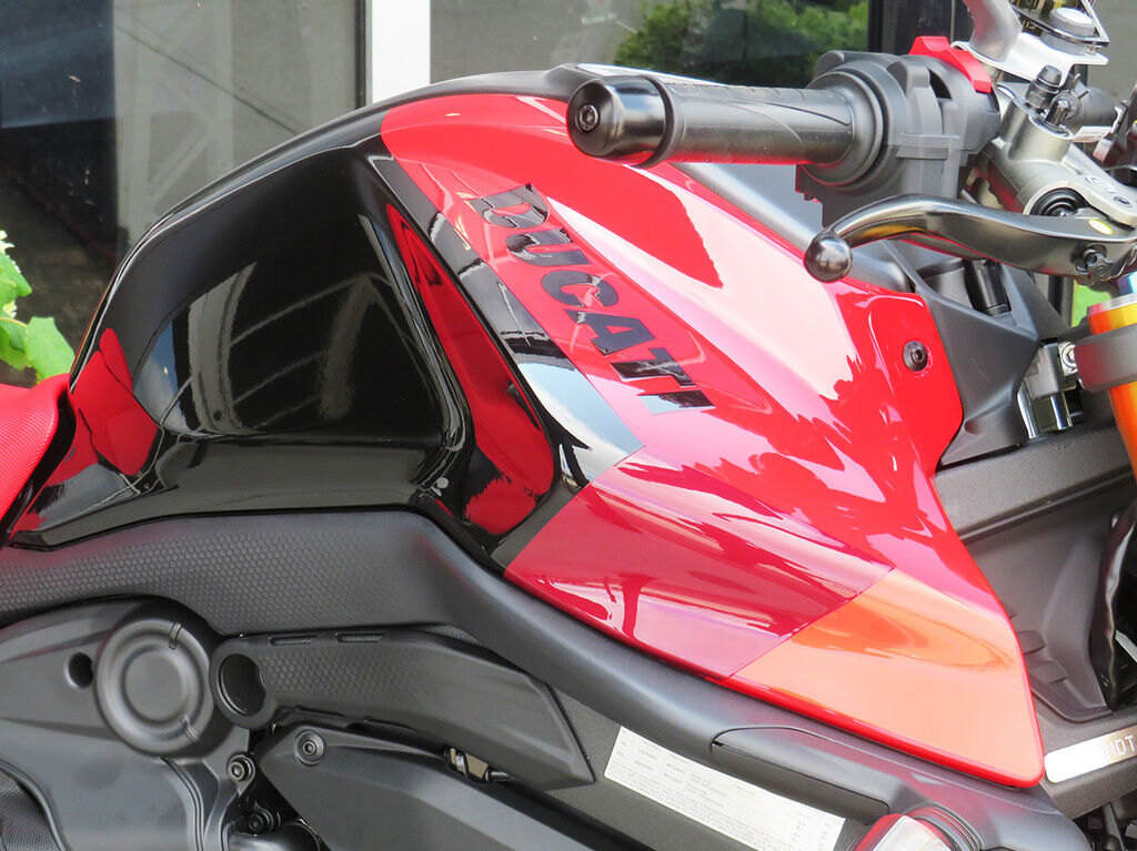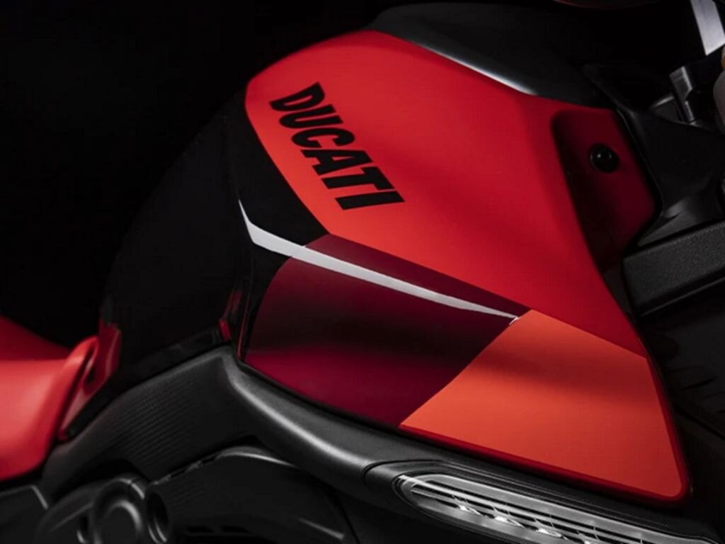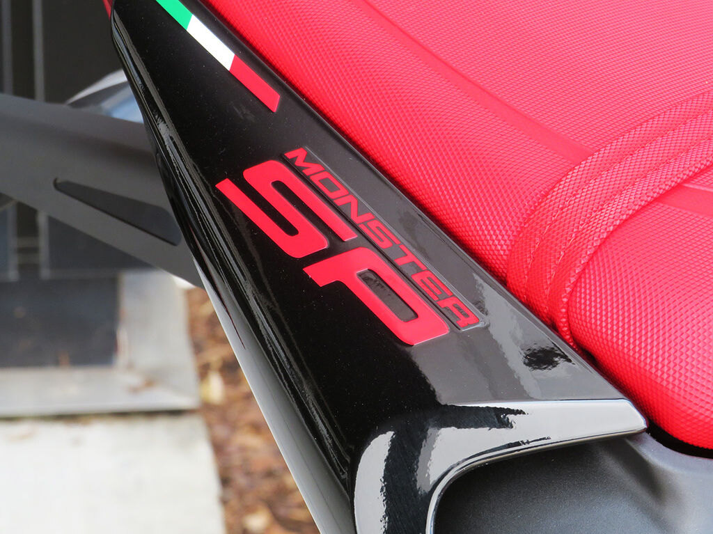 DESIGNThe livery, which incorporates the 2022 colors of the factory team\'s Desmosedici GP, reinforces the sporty nature of the new Monster SP. The Ducati lettering on the tank is reminiscent of the graphics on the Panigale V4. The red-colored seat complements the side view of the tail with the Monster SP logo and the Italian flag on the passenger seat cover.