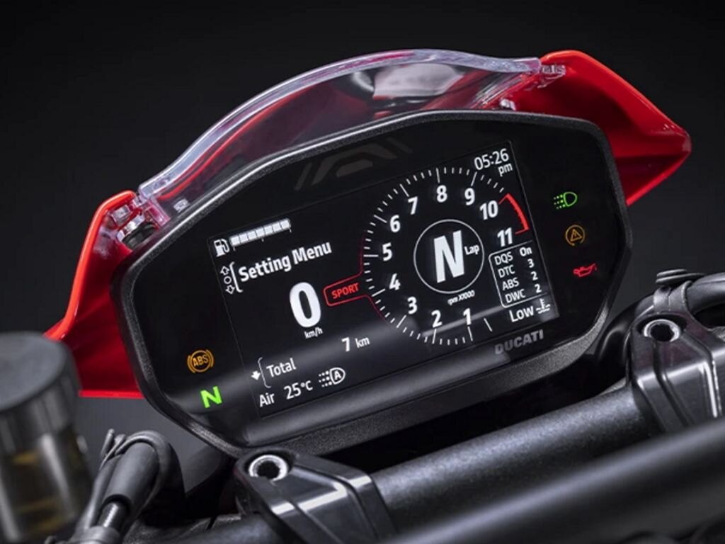 ELECTRONICSThe electronic sector of the Monster is at the top of the segment. The standard equipment includes ABS Cornering, Ducati Traction Control and Ducati Wheelie Control, all adjustable to various levels of intervention. The sporty character of the new Monster SP is also underlined by the Launch Control which ensures lightning-fast starts. This top-of-the-range motorcycle equipment allows the Monster SP to safely express its full performance.