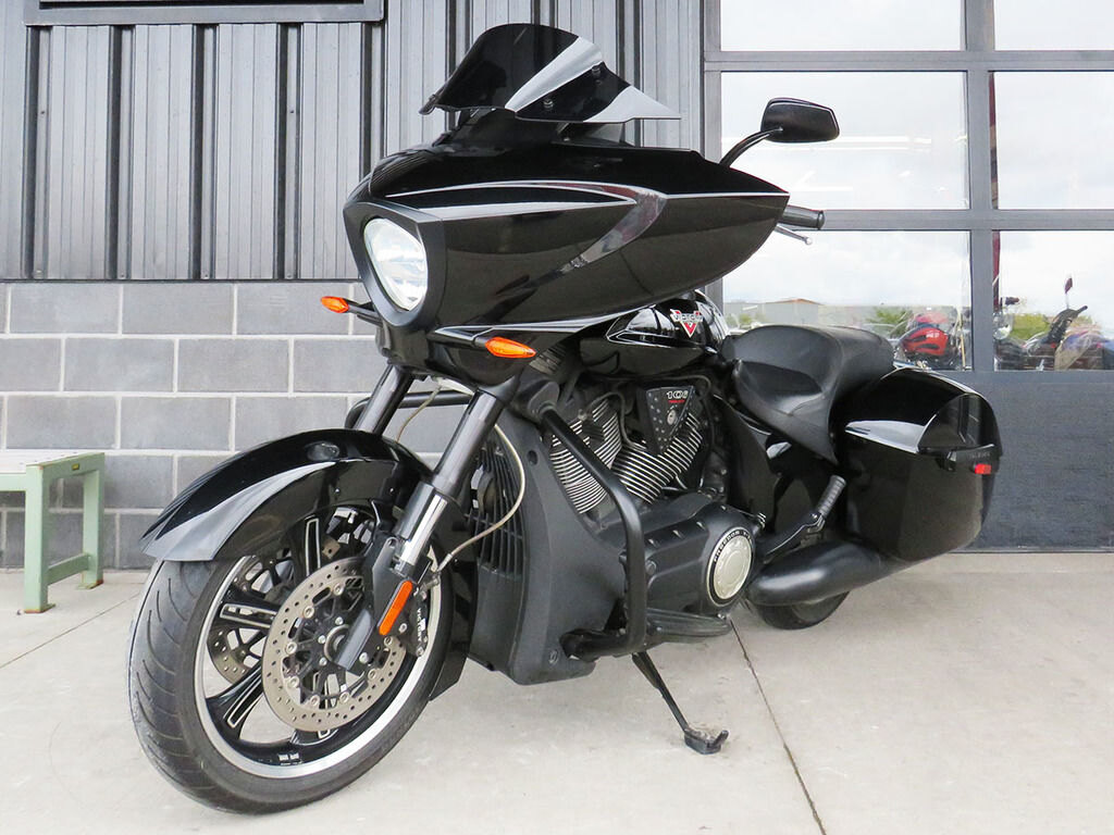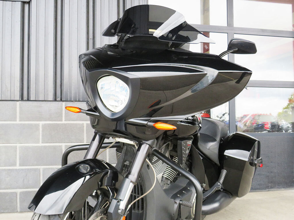 Bagger motorcycle riders ride in style on the Cross Country 8-Ball from Victory Motorcycles. It has a stylish fairing, audio, convenient storage space, comfortable seating for one or two riders, and blacked-out style.