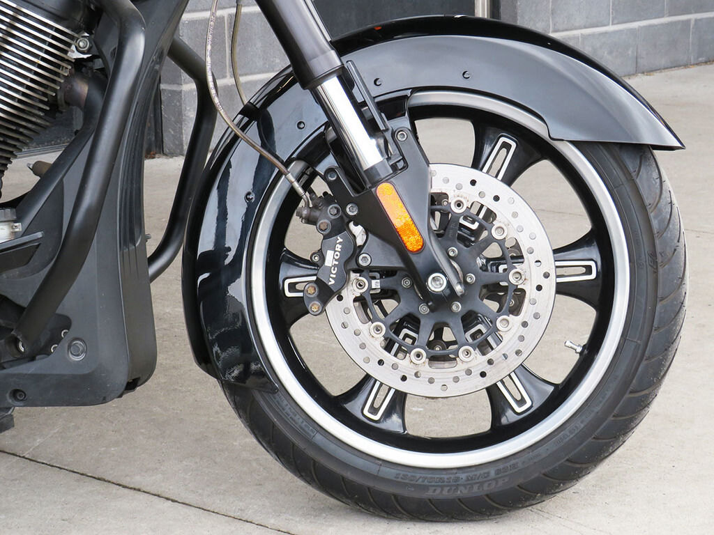 With the Victory Cross Country 8-Ball, you’ve got attitude and power. The 106-ci Victory® Freedom® V-Twin delivers 106 ft-lb of torque, and it’s a smooth, efficient engine counter-balanced and fuel-injected. The 6th gear overdrive of the Victory 6-speed transmission drops the RPMs and delivers the smooth ride you’re looking for.