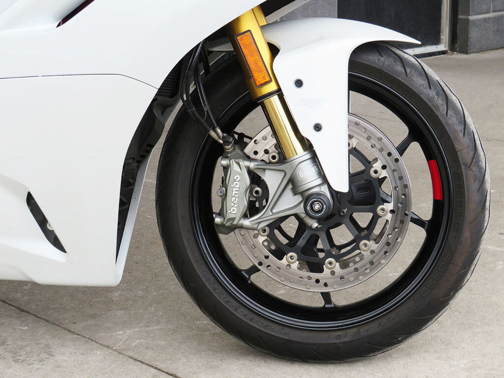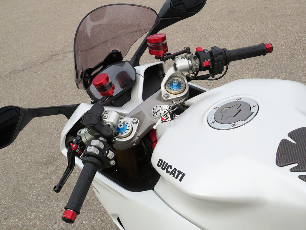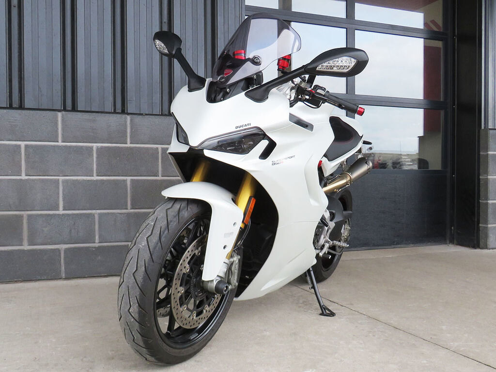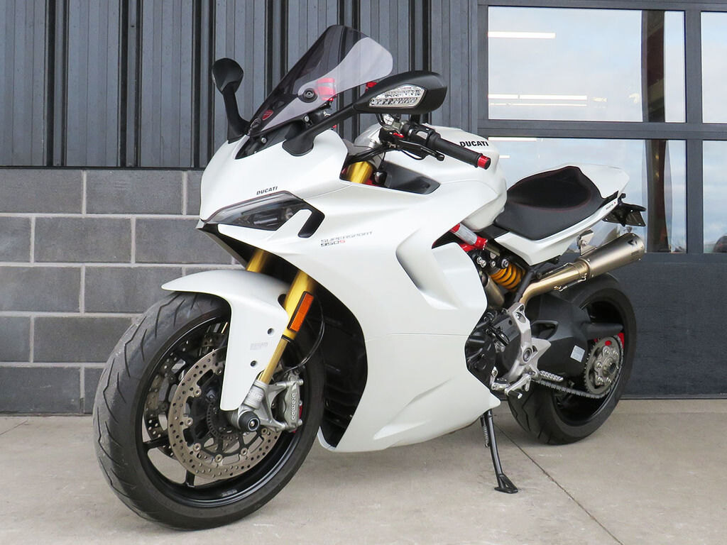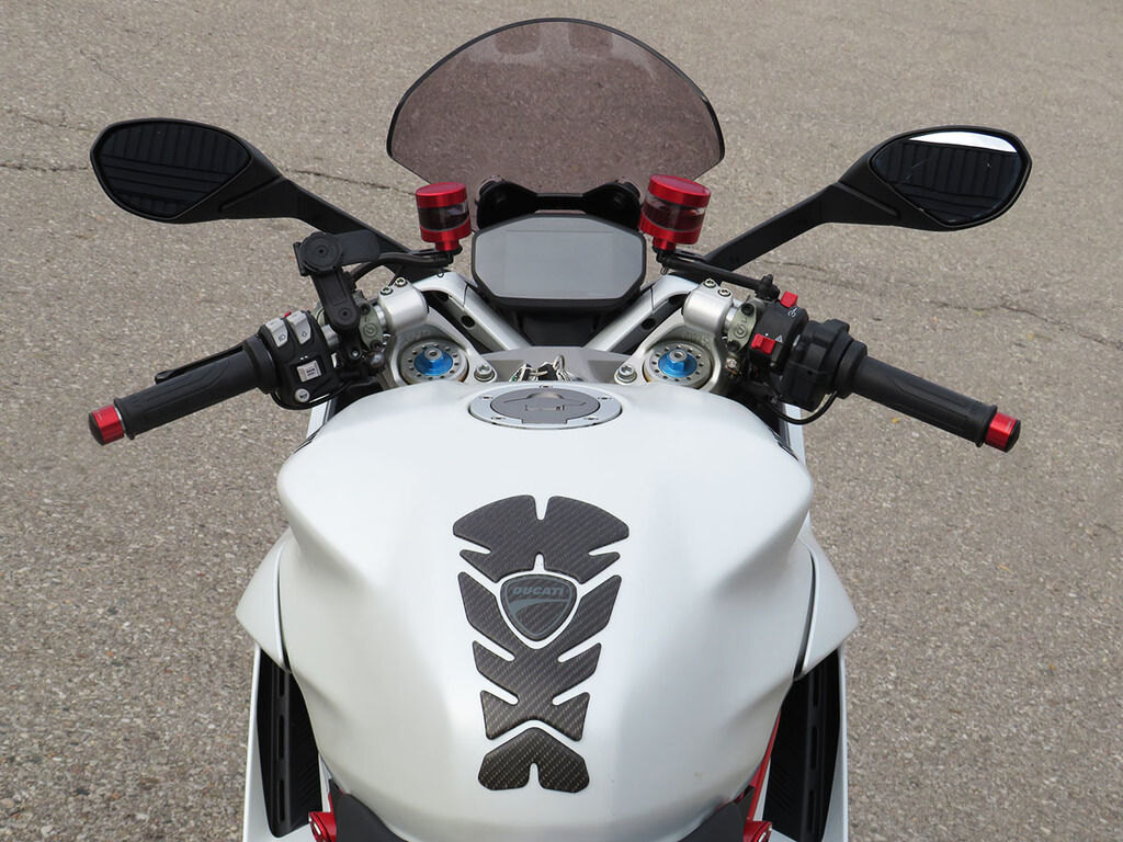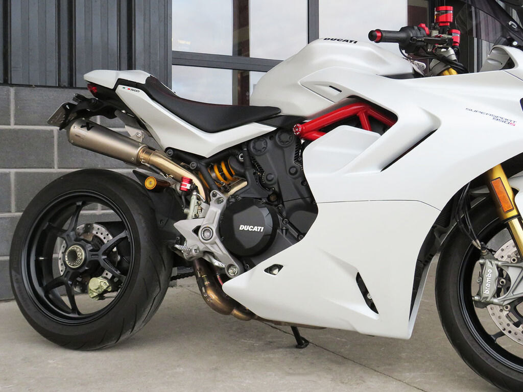 With it\'s single-sided swingarm, Ohlins suspension, torquey L-twin, and design lines that are 100% Ducati, we could understand someone\'s disbelief when they are told that the Supersport S makes a surprisingly great daily rider with ergonomics that will make you regret having to stop for fuel. This Supersport will add to that disbelief with added accessories that increase the sporty side of this popular bike\'s persona. These include a full Akrapovic titanium twin exhaust, Evotech rad guards, levers, and tail tidy, Rizoma master cylinders, bar-ends, and a tinted windscreen. If the no compromise appeal of a Supersport has been on your wishlist, this is the one you want!