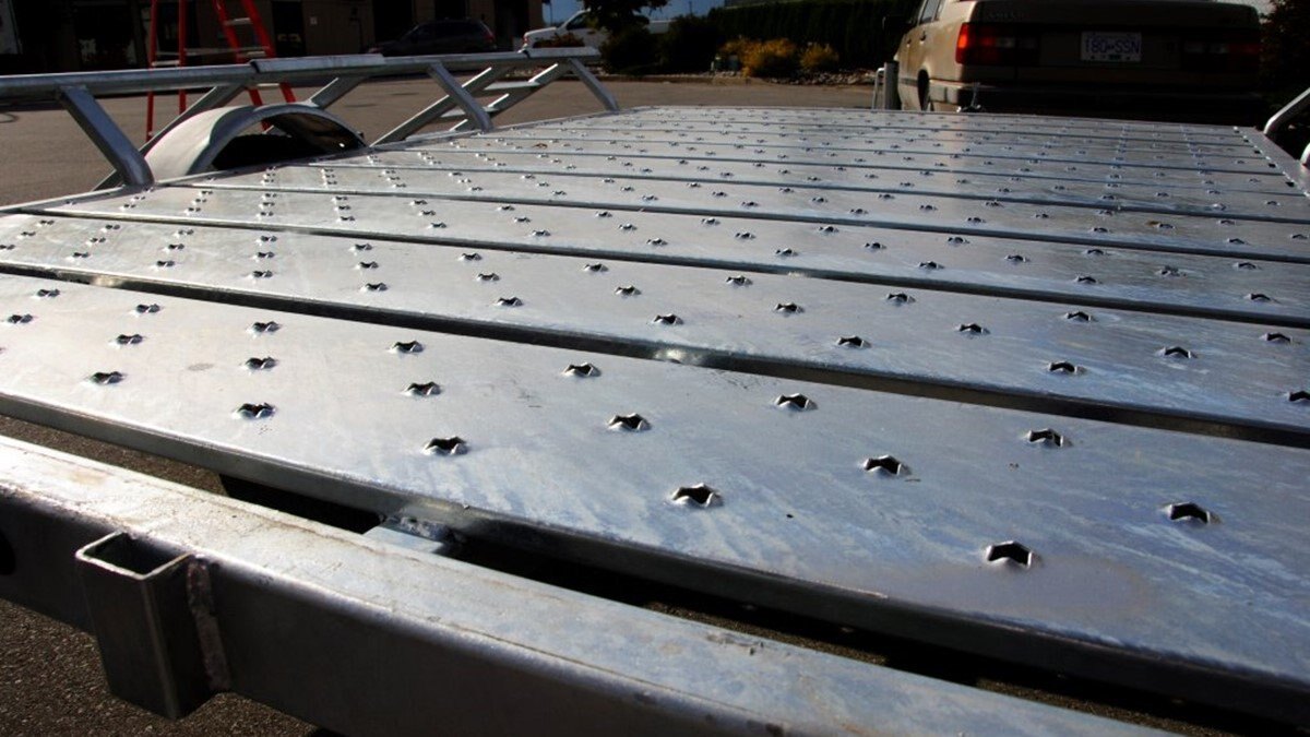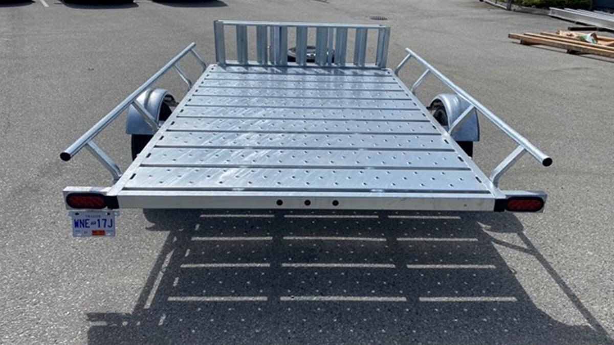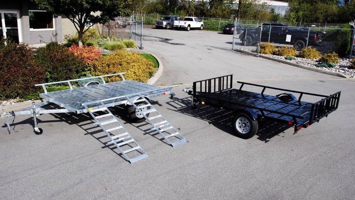 The Marlon Rat-02 Utility Trailer is the upgrade to our bestselling ATV trailer! The Rat-02 comes standard with steel floor decking with punched floor for grip! It is available in powder coated paint or galvanized finish. We have designed this trailer so that the loading ramps, hook on over the rear trailer frame for rear loading or hook onto the side bars for easy side loading of ATV's. The ends of each steel floor panel have notches cut out for securing straps. The loading ramps can be stored on the trailer in the front (pictures show storage of ramps in both front and back but that is no longer available). The Rat-02 complies with Canadian and US D.O.T. requirements.