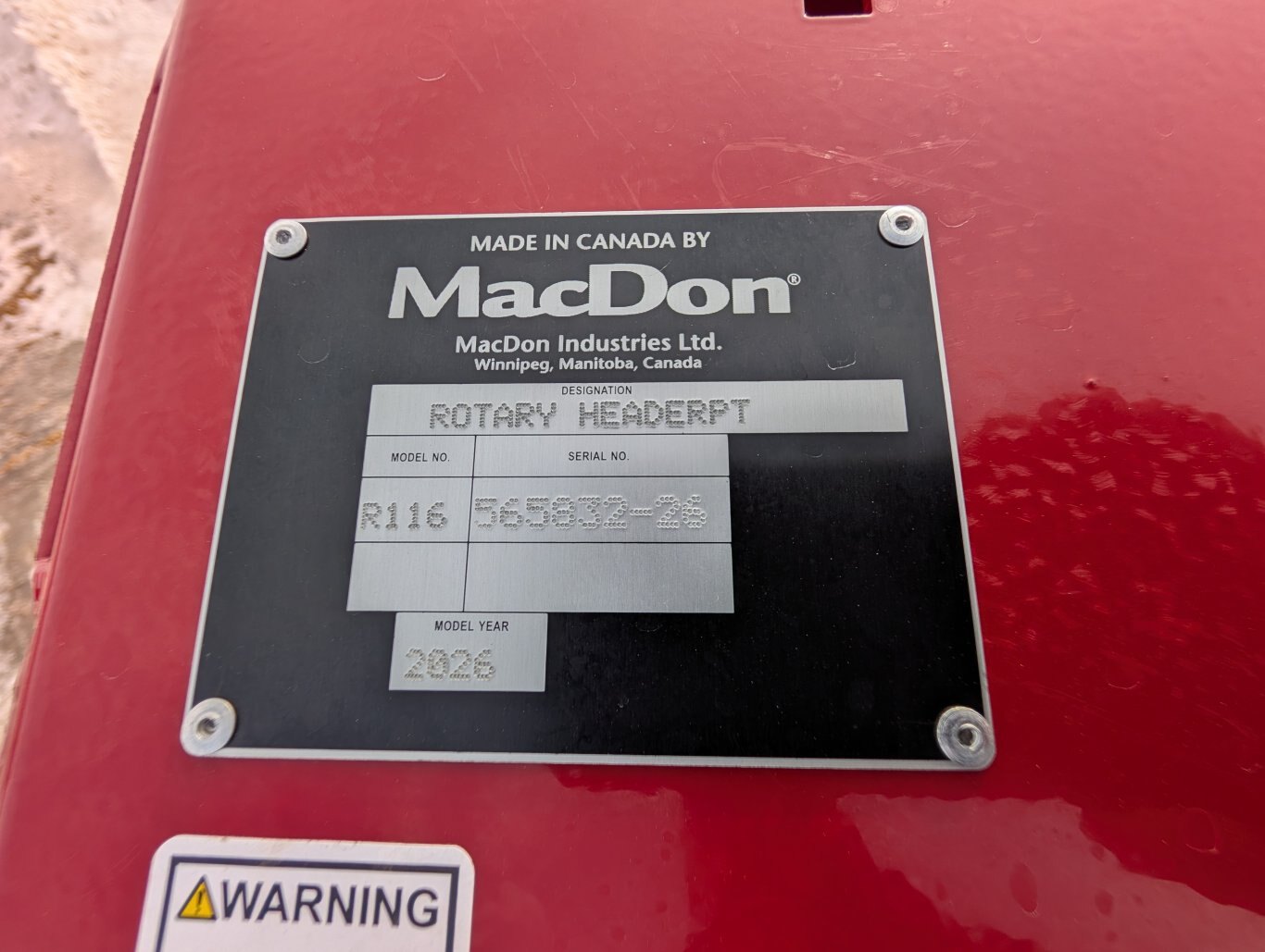 2026 MacDon R116. 16' Pull type mower/conditioner. Features forward-mounted cutterbar design and the industry's widest rolls at 129" which results in well-formed, well-conditioned windrows. Comes with a 3 year cutterbar warranty, and each of the discs features a shearpin which will disable it when contact is made that stops the disc. The disc then moves up and out of the path of the obstruction preventing any serious damage to the cutterbar. The shear pin can then be easily replaced in-field. Comes with steel inter-meshing rolls which are ideal for high volume crops where aggressive feeding through the header is required. In smooth stemmed crops, the steel roll action promotes even plant dry down by creating uniform crimps on the plant stem without bruising the delicate leaves. Extreme durability and minimal maintenance. -1000 pto -125hp min requirement -16' cutting width -10 discs, 2 blades per -6240 lbs -Requires 3 remotes with the hydraulic header angle adjustment option which is included -Intermeshing steel rolls