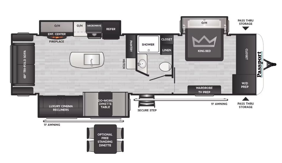 Passport delivers ultra-lightweight camping loaded with multi-functional features and best-in-class storage. Passport premium models features the brand's most spacious floorplans—including vaulted ceilings. A new front cap profile not only adds more interior room at the front of these models, it's molded from high-impact resin is lighter and three times more resilient -- even in cold temperatures. For 2024, Passport has warmed up their signature teak cabinetry with new light countertops, upholstery, and flooring. An accent wall featuring a gold geometric pattern, black appliances and bold origami-inspired door pulls punch up this exciting look.