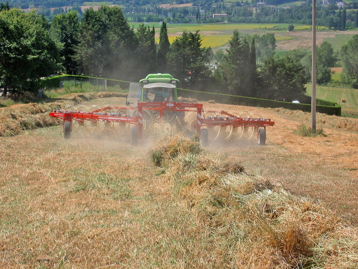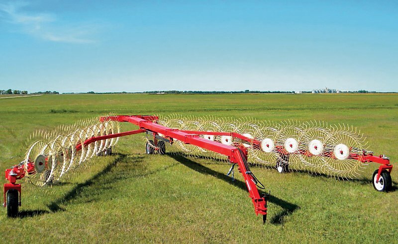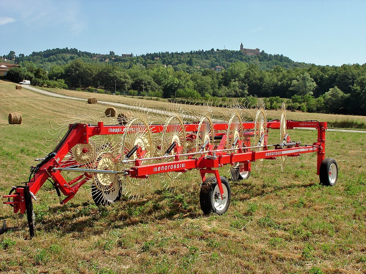 RAKING YOUR WINDROWS WITH THE FARM KING EASY RAKE ELIMINATES NUMEROUS FIELD PASSES AND PROVIDES UNIFORM ROWS. The Farm King Easy Rake comes available with 10, 12 and 14 rake wheel configurations and working widths of 21, 24 and 27 respectively. Each rake wheel comes with a fully independent suspension spring and bounce adjustment chain. The adjustable chain prevents the rake wheels from gouging uneven field terrain but allow the wheels to stay closely conformed to the field surface. |