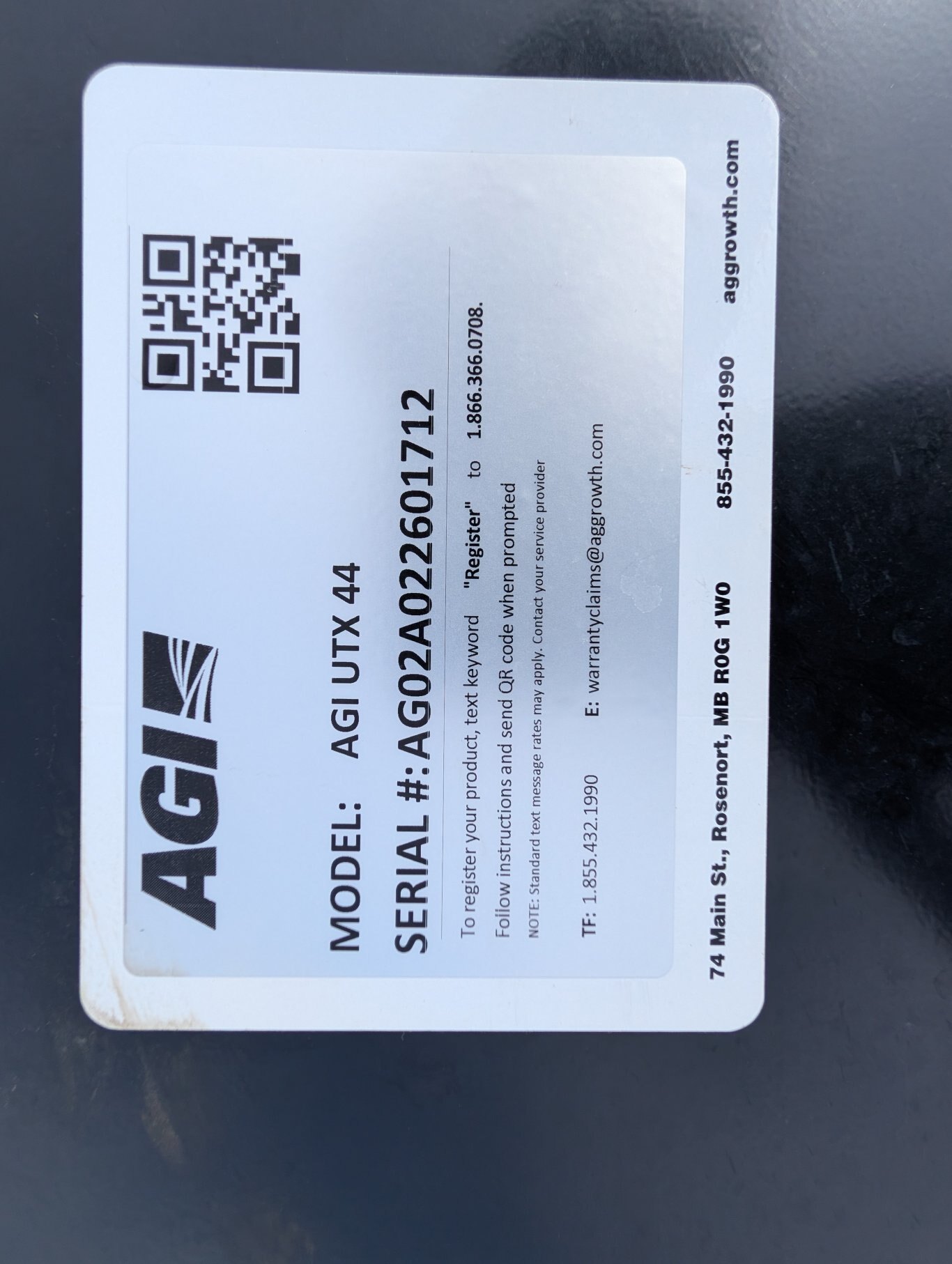2026 AGI UTX44 U-Trough Auger. Vanguard 40hp engine, self-propelled AWD unit with steel hydraulic lines, LED work lights, 7,000-9,000 bhp, farm-ready package.