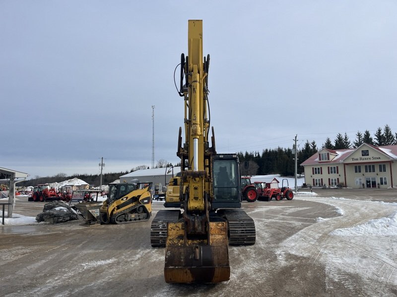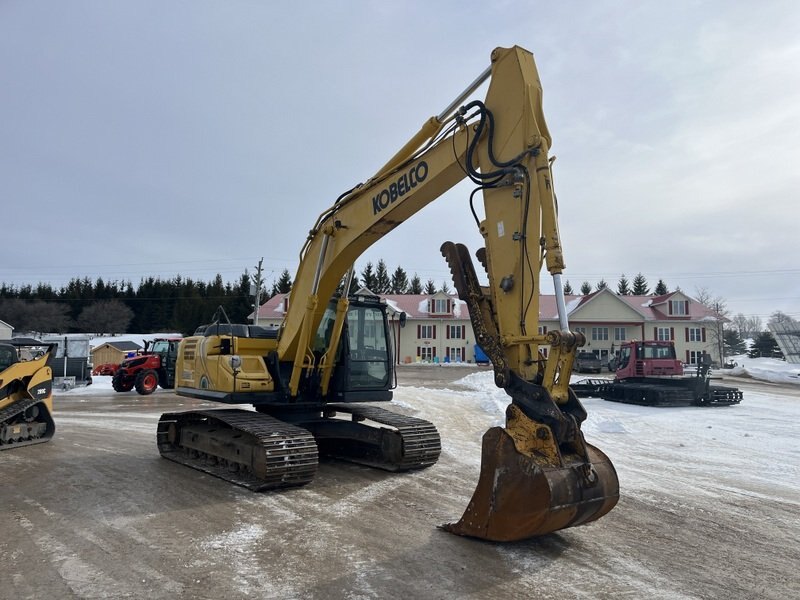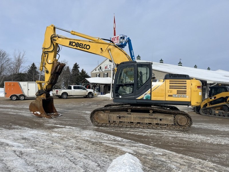 2019 Kobelco SK210LC-10 Excavator is powered by a 166hp Hino diesel engine.  Machine weighs about 48,000lbs. Enclosed cab with all glass intact. Unit is equipped with hydraulic pin grabber, hydraulic thumb and auxiliary plumbing. Comes with one tooth bucket. Hour meter reads 8215. Located in Maxwell Ontario
